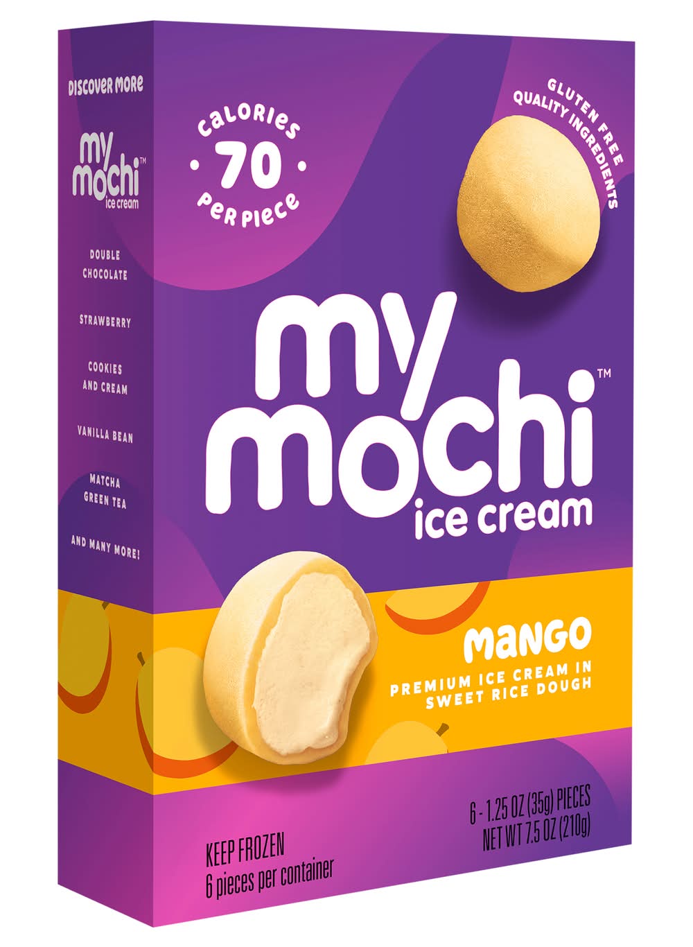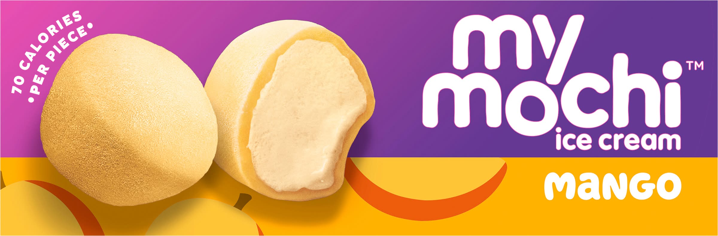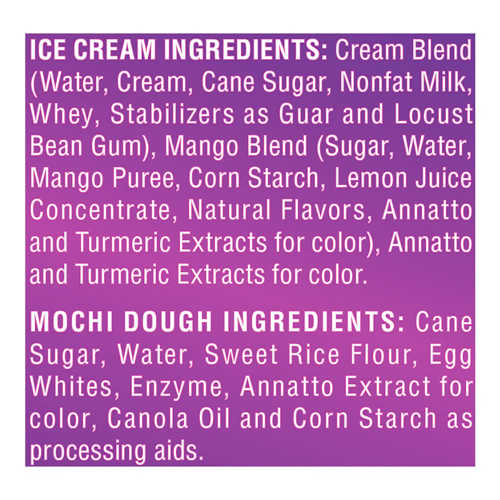 Ingredients: Ice Cream Ingredients: Cream Blend (Water, Cream, Cane Sugar, Nonfat Milk, Whey, Stabilizers as Guar and Locust Bean Gum), Mango Blend (Sugar, Water, Mango Puree, Corn Starch, Lemon Juice Concentrate, Natural Flavors, Annatto and Turmeric Extracts for Color), Annatto and Turmeric Extracts for Color. Mochi Dough Ingredients: Cane Sugar, Water, Sweet Rice Flour, Egg Whites, Enzyme, Annatto Extract for Color, Canola Oil and Corn Starch as Processing Aids Contains: Milk, Eggs, Corn
