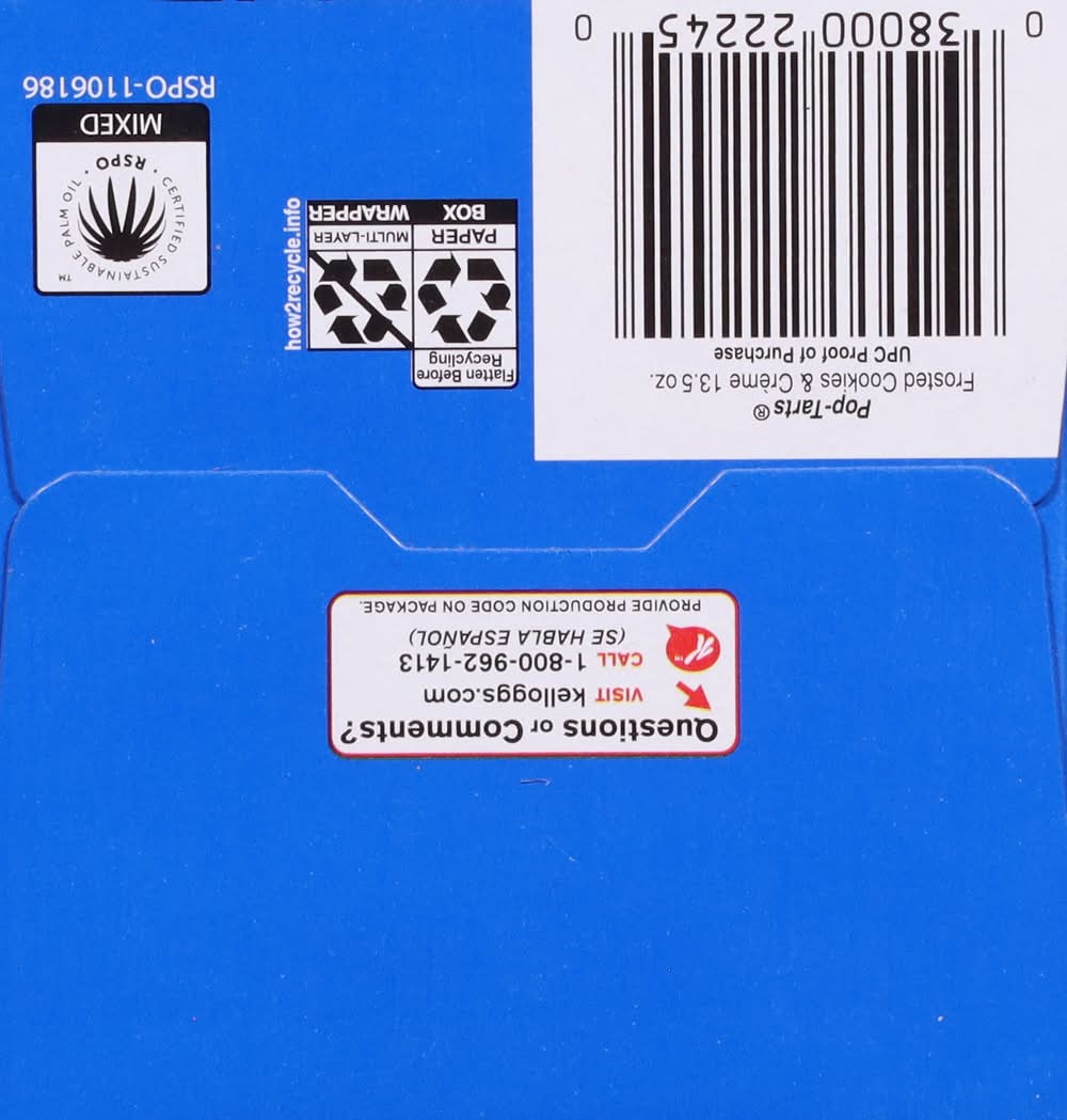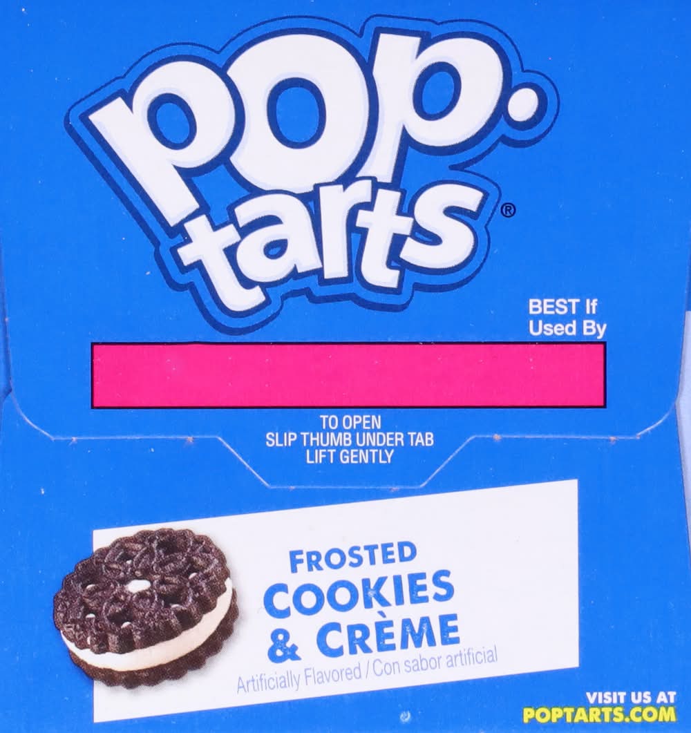 Pop-Tarts toaster pastries are the perfect sweet treat at breakfast, for a lunch snack, or dessert. Featuring a sweet Frosted Cookies and Creme filling and chocolatey crumbles in a soft pastry crust, this ready to eat treat is perfect for kids snacks and adult snacks on the go. Pack Pop-Tarts Frosted Cookies and Creme in kids lunchboxes for school snacks, or stock the office pantry with this individually wrapped grab and go adult snack. Pop them in the toaster and pair with milk, create your own ice cream sandwiches, or incorporate into your favorite dessert recipe for a sweet treat. These irresistible snacks for adults and kids provide a good source of three B vitamins. Stock your pantry with these shelf stable snacks and enjoy ready to eat treats anytime. A flavor for everyone, including beloved classics like Frosted Blueberry or Frosted Cherry, or our more indulgent flavors, Frosted S'mores or Frosted Chocolate Fudge. • Flavor: Cookies & crème • Kellogg sales co., Battle Creek, Mi, 49016. • Packaging: Reusable