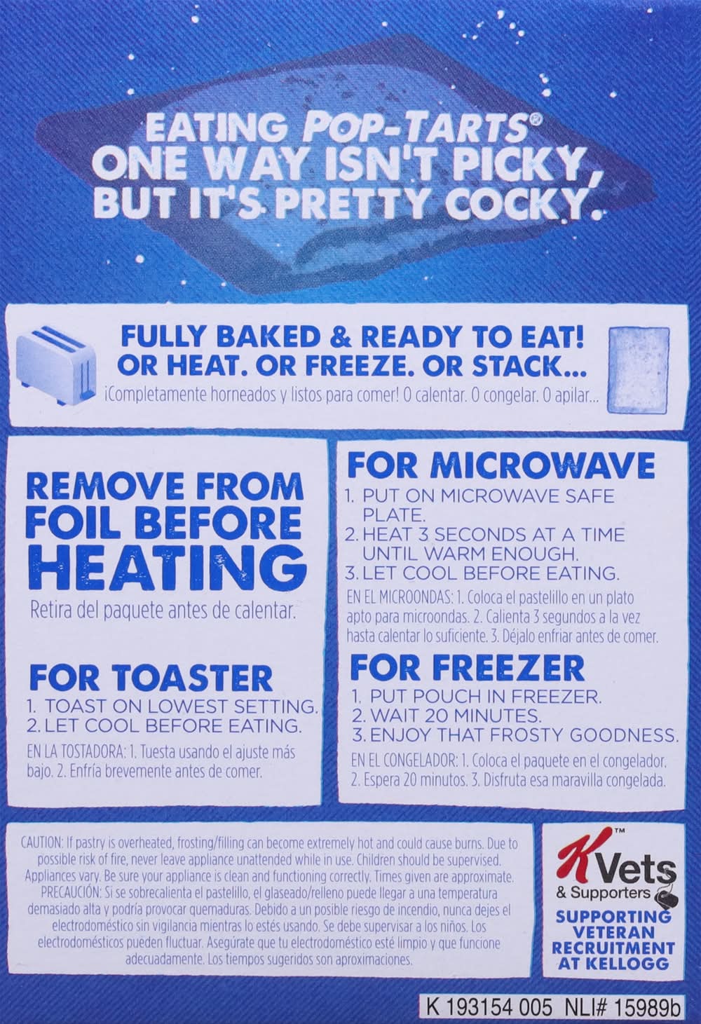 Remove from foil before heating. for toaster: 1. toast on lowest setting. 2. let cool before eating. for microwave: 1. put on microwave safe plate. 2. heat 3 seconds at a time until warm enough. 3. let cool before eating. for freezer: 1. put pouch in freezer. 2. wait 20 minutes. 3. enjoy that frosty goodness. to open slip thumb under tab lift gently.