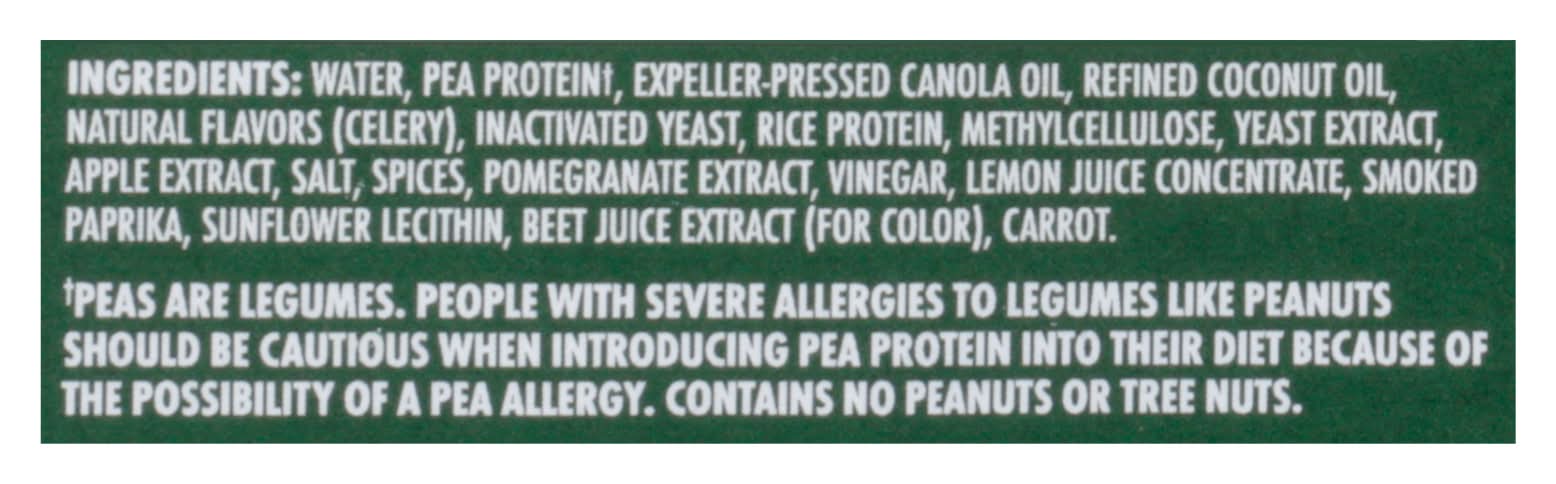 Ingredients: Water, Pea Protein (Peas are legumes), Expeller-Pressed Canola Oil, Refined Coconut Oil, Natural Flavors (Celery), Inactivated Yeast, Rice Protein, Methylcellulose, Yeast Extract, Apple Extract, Salt, Spices, Pomegranate Extract, Vinegar, Lemon Juice Concentrate, Smoked Paprika, Sunflower Lecithin, Beet Juice Extract (for Color), Carrot Contains: Tree Nuts