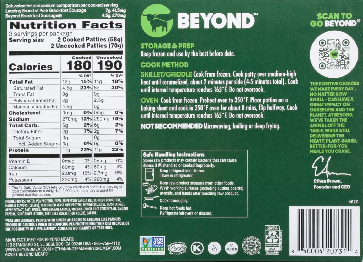 Since 1975. 35% less saturated fat & sodium than the leading brand of pork breakfast sausage. See nutrition information for fat and saturated fat content. The positive choices we make every day - no matter how small - can have a great impact on ourselves and the planet. At Beyond, we've taken the animal off the table, while still delivering the meaty, plant-based, better-for-you meals you crave. Packaging: Reusable