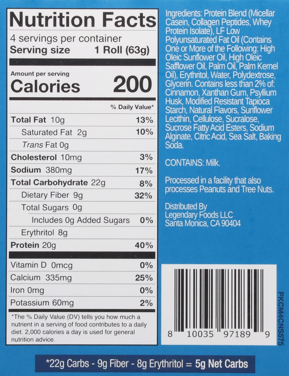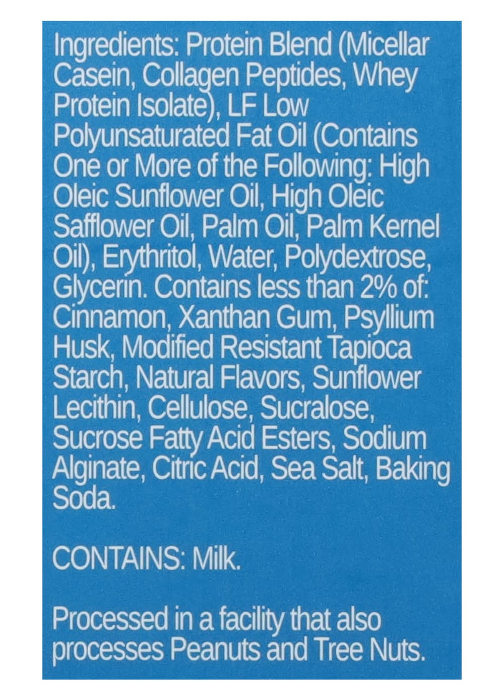 Ingredients: Protein Blend (Micellar Casein, Collagen Peptides, Whey Protein Isolate), LF Low Polyunsaturated Fat Oil (Contains One or More of the Following: High Oleic Sunflower Oil, High Oleic Safflower Oil, Palm Oil, Palm Kernel Oil), Erythritol, Water, Polydextrose, Glycerin, Contains Less than 2% of: Cinnamon, Xanthan Gum, Psyllium Husk, Modified Resistant Tapioca Starch, Natural Flavors, Sunflower Lecithin, Cellulose, Sucralose, Sucrose Fatty Acid Esters, Sodium Alginate, Citric Acid, Sea Salt, Baking Soda Contains: Milk, Peanuts, Tree Nuts