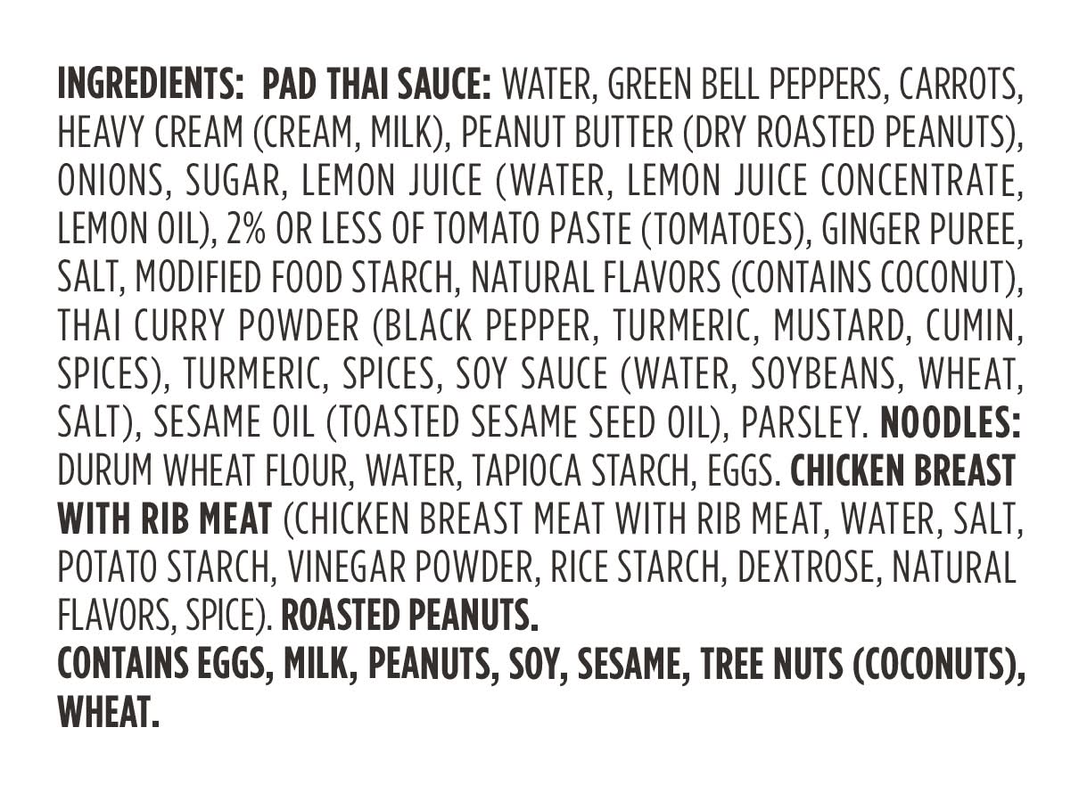 Ingredients: Pad Thai Sauce: Water, Green Bell Peppers, Carrots, Heavy Cream (Cream, Milk), Peanut Butter (Dry Roasted Peanuts), Onions, Sugar, Lemon Juice (Water, Lemon Juice Concentrate, Lemon Oil), 2% or Less of Tomato Paste (Tomatoes), Ginger Puree, Salt, Modified Food Starch, Natural Flavors (Contains Coconut), Thai Curry Powder (Black Pepper, Turmeric, Mustard, Cumin, Spices), Turmeric, Spices, Soy Sauce (Water, Soybeans, Wheat, Salt), Sesame Oil (Toasted Sesame Seed Oil), Parsley. Noodles: Durum Wheat Flour, Water, Tapioca Starch, Eggs. Chicken Breast with Rib Meat (Chicken Breast Meat with Rib Meat, Water, Salt, Potato Starch, Vinegar Powder, Rice Starch, Dextrose, Natural Flavors, Spice). Roasted Peanuts Contains: Eggs, Milk, Peanuts, Soybeans, Sesame, Tree Nuts, Coconuts, Wheat, Mustard