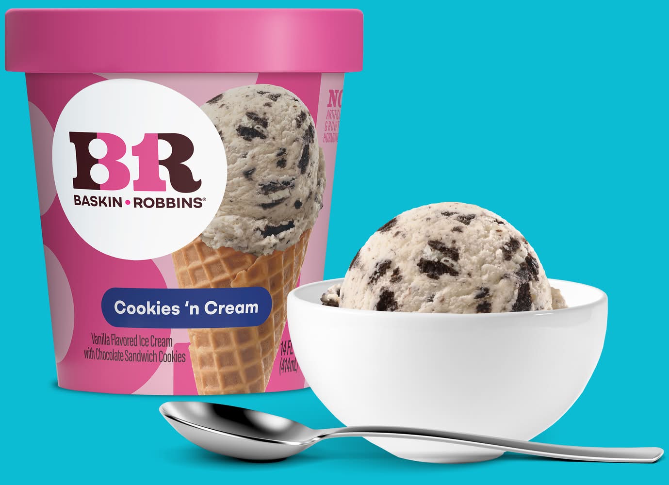 Baskin-Robbins Cookies 'N Cream is an all time, all family favorite. Cookies 'N Cream features vanilla flavored ice cream with chocolate sandwich cookies. Dunking classic chocolate sandwich cookies in milk has always been a no-brainer! But blending the cookie pieces into creamy vanilla flavored ice cream? Well now, that's genius. Flavor: Cookies 'n cream