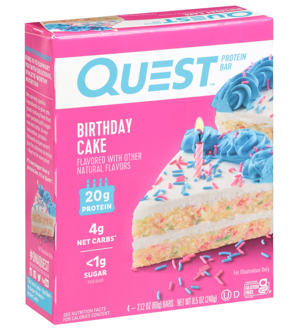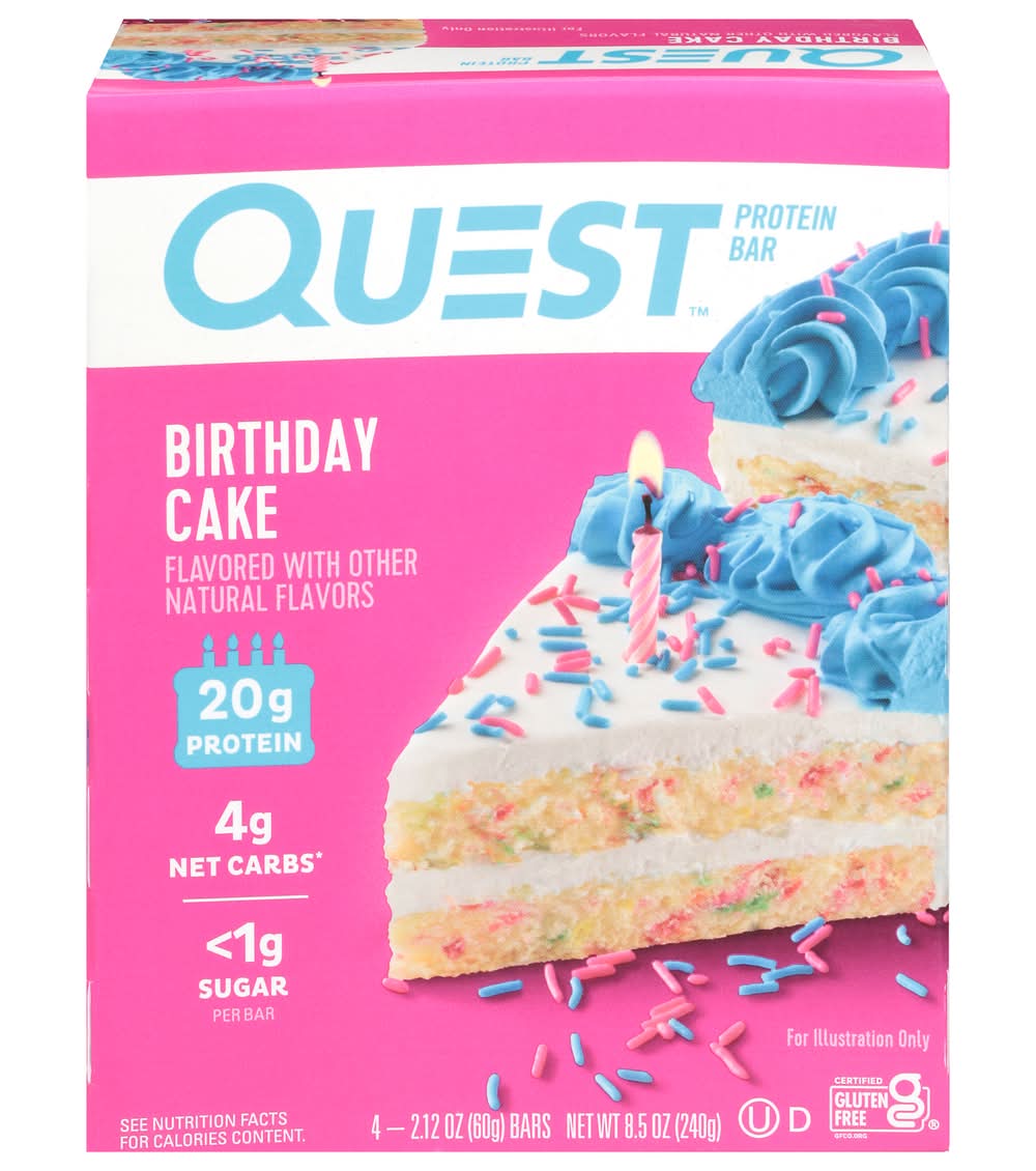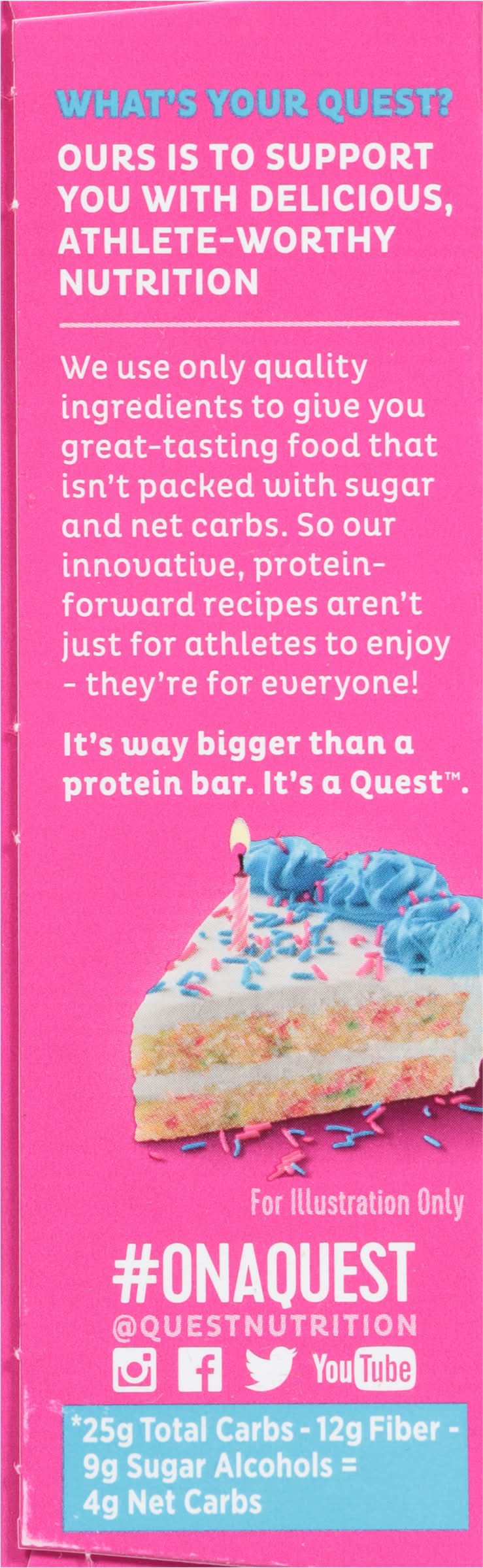 Bite into the celebratory taste of frosted birthday cake! We think everyone deserves a slice of birthday cake on any day for any occasion, including you! Quest Nutrition Birthday Cake protein bars are chewy coated protein bars with the craveable celebratory taste of birthday cake! With 21g of protein and less than 1g of sugar Quest Nutrition Birthday Cake Protein Bar is the perfect way to celebrate every day's sweet moments. Quest protein bars are perfect for on-the-go athlete worthy nutrition. grab and take to the gym, mid-day snack, car ride protein snack, or anytime you crave Birthday Cake! Package includes 4 individually wrapped gluten free, keto protein bars. • Flavor: Birthday cake • Pack size: 4 • Quest Nutrition, Llc, El Segundo,CA,90245