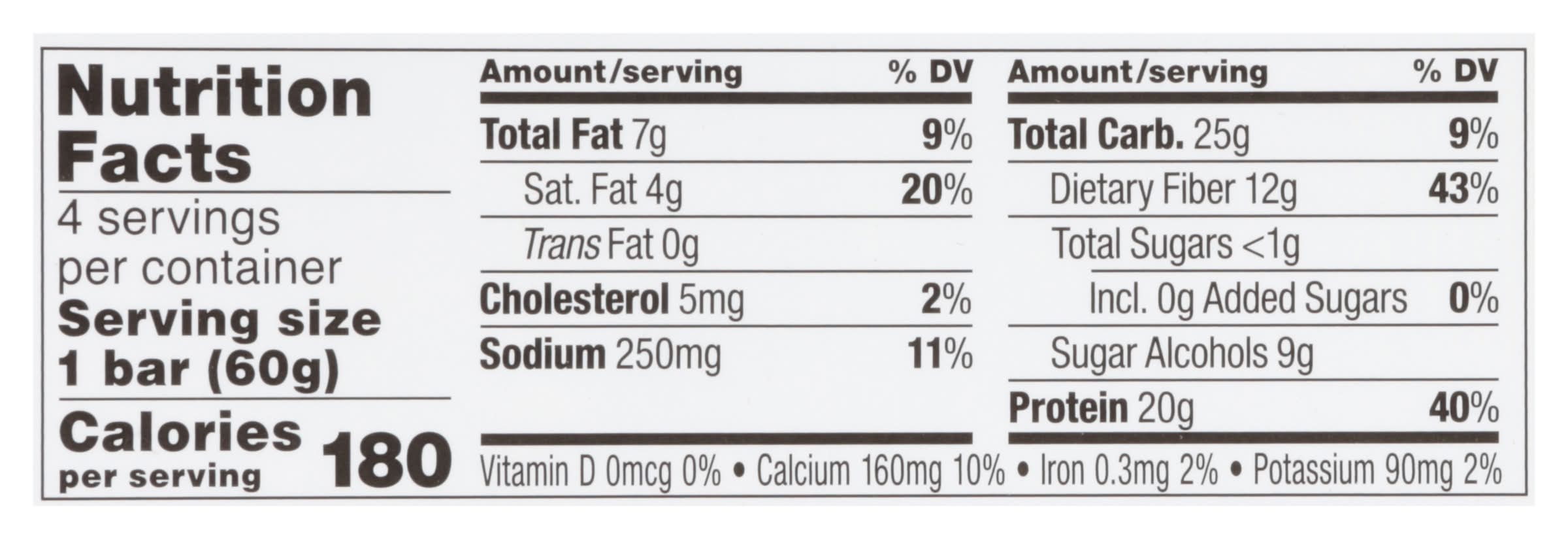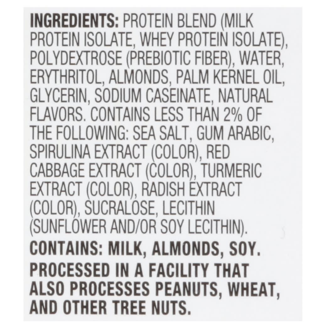 Ingredients: Protein Blend (Milk Protein Isolate, Whey Protein Isolate), Polydextrose (Prebiotic Fiber), Water, Erythritol, Almonds, Palm Kernel Oil, Glycerin, Sodium Caseinate, Natural Flavors, Contains Less than 2% of the Following: Sea Salt, Gum Arabic, Spirulina Extract (Color), Red Cabbage Extract (Color), Turmeric Extract (Color), Radish Extract (Color), Sucralose, Lecithin (Sunflower and/or Soy Lecithin) Contains: Milk, Tree Nuts, Almonds, Soybeans, Peanuts, Wheat, Tree Nuts
