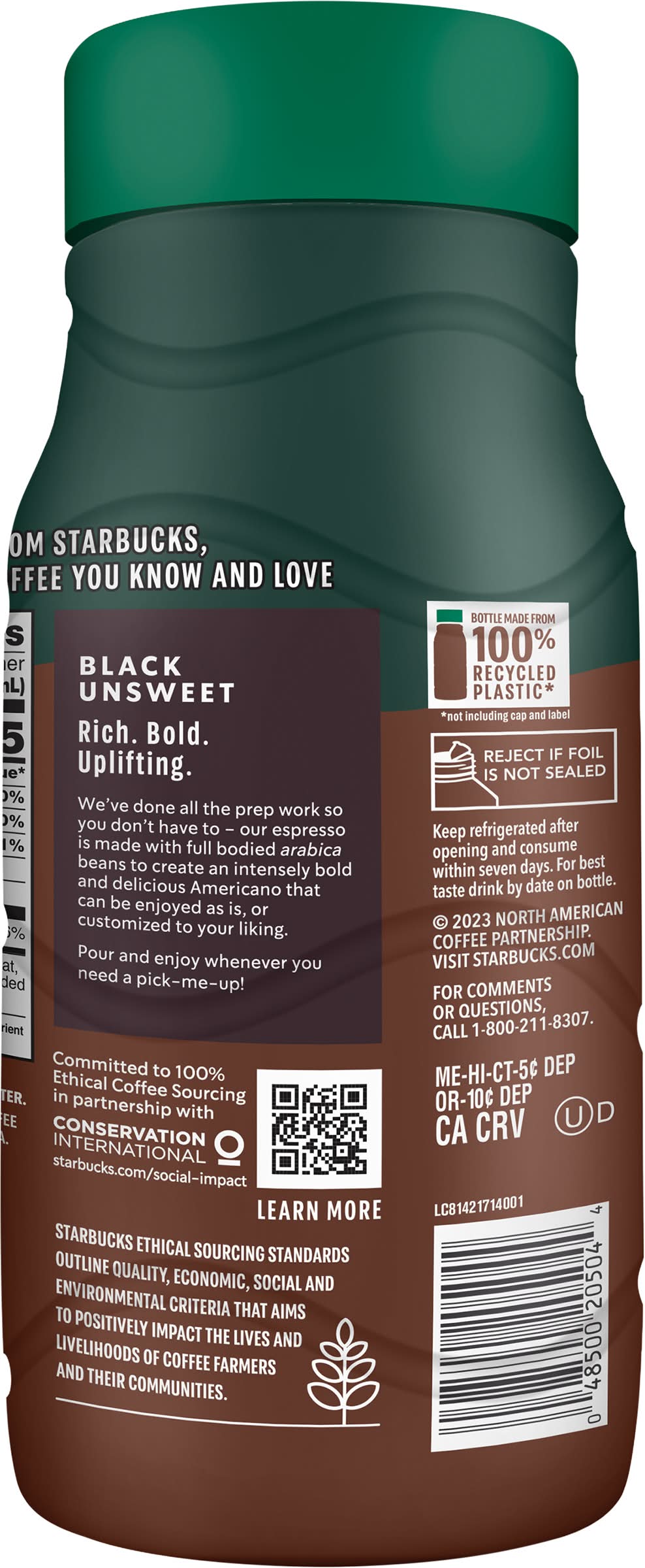 Unsweet. Hello from Starbucks, makers of the coffee you know and love. Rich. Bold. Uplifting. We've done all the prep work so you don't have to - our espresso is made with full bodied Arabica beans to create an intensely bold and delicious Americano that can be enjoyed as is, or customized to your liking. Pour and enjoy whenever you need a pick-me-up! Committed to 100% ethical coffee sourcing in partnership with Conservation International. Starbucks ethical sourcing standards outline quality, economic, social and environmental criteria that aims to positively impact the lives and livelihoods of coffee farmers and their communities. Packaging: Reusable