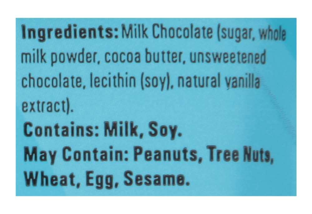 Ingredients: Milk Chocolate (Sugar, Whole Milk Powder, Cocoa Butter, Unsweetened Chocolate, Lecithin [Soy], Natural Vanilla Extract) Contains: Milk, Soybeans, Peanuts, Tree Nuts, Wheat, Eggs, Sesame