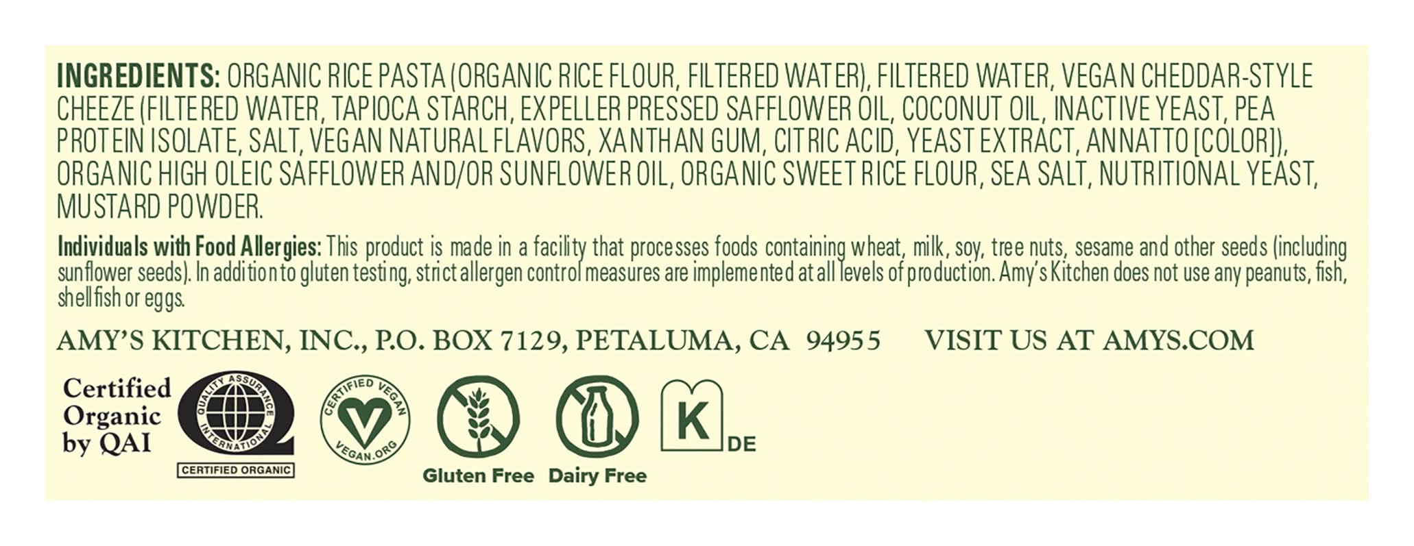 Ingredients: ORGANIC RICE PASTA (ORGANIC RICE FLOUR, FILTERED WATER), FILTERED WATER, VEGAN CHEDDAR-STYLECHEEZE (FILTERED WATER, TAPIOCA STARCH, EXPELLER PRESSED SAFFLOWER OIL, COCONUT OIL, INACTIVE YEAST, PEAPROTEIN ISOLATE, SALT, VEGAN NATURAL FLAVORS, XANTHAN GUM, CITRIC ACID, YEAST EXTRACT, ANNATTO [COLOR]), ORGANIC HIGH OLEIC SAFFLOWER AND/OR SUNFLOWER OIL, ORGANIC SWEET RICE FLOUR, SEA SALT, NUTRITIONAL YEAST, MUSTARD POWDER. Contains: Mustard, Wheat, Milk, Soybeans, Tree Nuts, Sesame