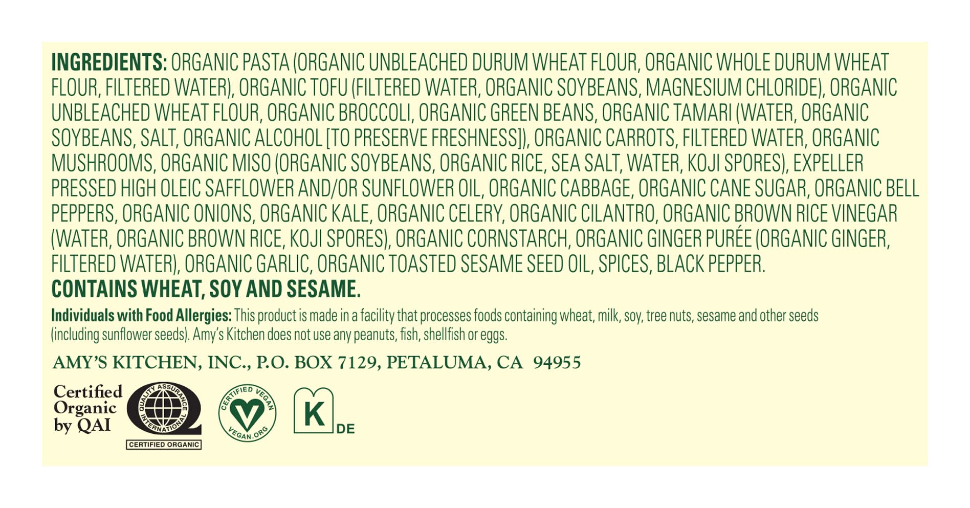 Ingredients: ORGANIC PASTA (ORGANIC UNBLEACHED DURUM WHEAT FLOUR, ORGANIC WHOLE DURUM WHEAT FLOUR, FILTERED WATER), ORGANIC TOFU (FILTERED WATER, ORGANIC SOYBEANS, MAGNESIUM CHLORIDE), ORGANIC UNBLEACHED WHEAT FLOUR, ORGANIC BROCCOLI, ORGANIC GREEN BEANS, ORGANIC TAMARI (WATER, ORGANIC SOYBEANS, ORGANIC ALCOHOL [TO PRESERVE FRESHNESS], SALT), ORGANIC CARROTS, FILTERED WATER, ORGANIC MUSHROOMS, ORGANIC CABBAGE, ORGANIC CARROTS, ORGANIC ONIONS, ORGANIC KALE, ORGANIC TOFU [FILTERED WATER, ORGANIC SOYBEANS, MAGNESIUM CHLORIDE], ORGANIC MUSHROOMS, ORGANIC MISO (ORGANIC SOYBEANS, ORGANIC RICE, SEA SALT, WATER, KOJI SPORES), EXPELLER PRESSED HIGH OLEIC SAFFLOWER AND/OR SUNFLOWER OIL, ORGANIC CABBAGE, ORGANIC CANE SUGAR, ORGANIC BELL PEPPERS, ORGANIC ONIONS, ORGANIC KALE, ORGANIC CELERY, ORGANIC CILANTRO, ORGANIC BROWN RICE VINEGAR (FILTERED WATER, ORGANIC BROWN RICE, SALT, KOJI SPORES), ORGANIC CORNSTARCH, ORGANIC GINGER PURÉE (FILTERED WATER, ORGANIC GINGER), ORGANIC GARLIC, ORGANIC TOASTER SESAME SEED OIL, SPICES, BLACK PEPPER. CONTAINS WHEAT AND SOY. Includes Sesame Seeds. Contains: 'Contains Wheat', 'Contains Soybeans', 'Contains Sesame', 'May Contain Milk', 'May Contain Tree Nuts', 'May Contain Sesame'