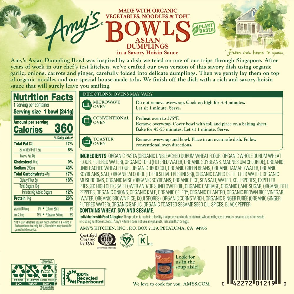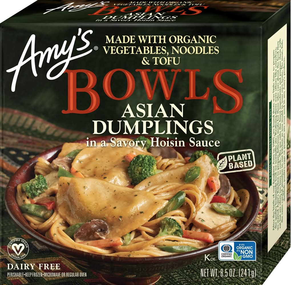 Amy’s Asian Dumpling Bowl is made with organic veggie dumplings, organic noodles, our house-made tofu and finished with a rich and savory hoisin sauce. The Asian Dumpling Bowl is a great lunch or dinner option for busy weekdays when you don't have time to cook from scratch. The microwave meal is easy to prepare and heats up quickly. Whether you're looking for a quick and easy dinner or a tasty side dish, these frozen meals have you covered. Since 1987, Amy's has produced delicious, convenient vegetarian food and frozen dinners for people who are sometimes too busy to cook. • Number of servings: 1 • Packaging: Reusable