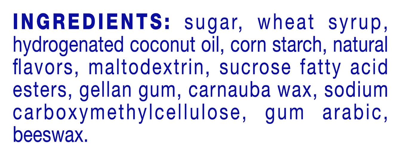 Ingredients: Sugar, Wheat Syrup, Hydrogenated Coconut Oil, Corn Starch, Natural Flavors, Maltodextrin, Sucrose Fatty Acid Esters, Gellan Gum, Carnauba Wax, Sodium Carboxymethylcellulose, Gum Arabic, Beeswax Contains: Wheat, Tree Nuts, Coconuts, Corn