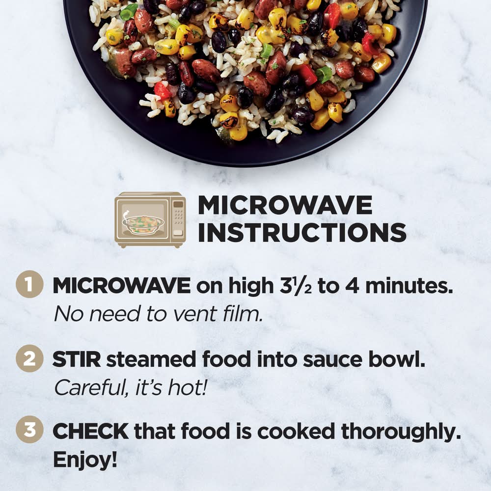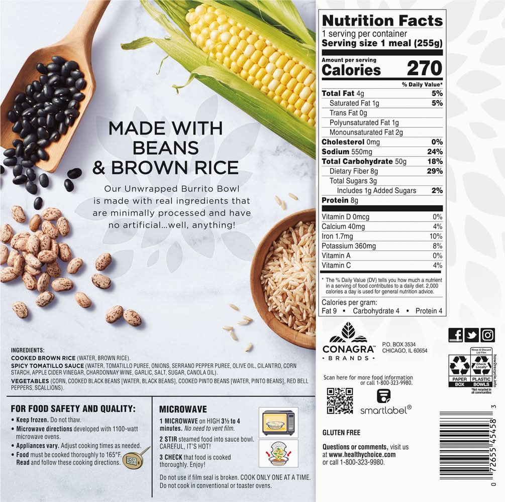 Healthy Choice Simply Steamers Unwrapped Burrito Bowl Frozen Meal satisfies your cravings with quality ingredients. Savor a quick and delicious meal from the microwave anytime. This dish combines black and pinto beans, red bell peppers, roasted corn, scallions and fluffy brown rice tossed in tomatillo sauce for a meal that's as delicious as it is healthy. Made with no preservatives, this wholesome, microwave-ready meal delivers a bold experience any day of the week. Perfect for an on-the-go power lunch or a quick and delicious dinner at home after a long day, this single-serve meal contains 270 calories per serving. Healthy Choice makes it easy to eat mindfully with bold, flavorful meals made with high-quality ingredients and contemporary recipes that are easy to prepare. Stock your freezer with a variety of Healthy Choice Simply Steamers to keep healthy, wholesome meals on hand. • Number of servings: 1 • Conagra, Chicago, IL, 60654 • Packaging: Reusable