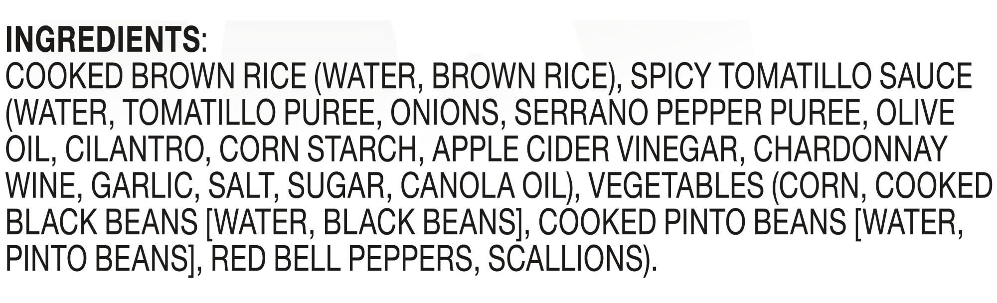 Ingredients: COOKED ORGANIC BROWN RICE (WATER, ORGANIC BROWN RICE), . SPICY TOMATILLO SAUCE (WATER, TOMATILLO PUREE [ORGANIC TOMATILLOS], ONIONS, SERRANO PEPPER PUREE, OLIVE OIL, CILANTRO, CORN STARCH, ORGANIC CIDER VINEGAR, CHARDONNAY WINE, GARLIC, SALT, SUGAR, CANOLA OIL), . VEGETABLES (ORGANIC CORN, COOKED ORGANIC BLACK BEANS, COOKED ORGANIC PINTO BEANS, RED BELL PEPPERS, SCALLIONS), .