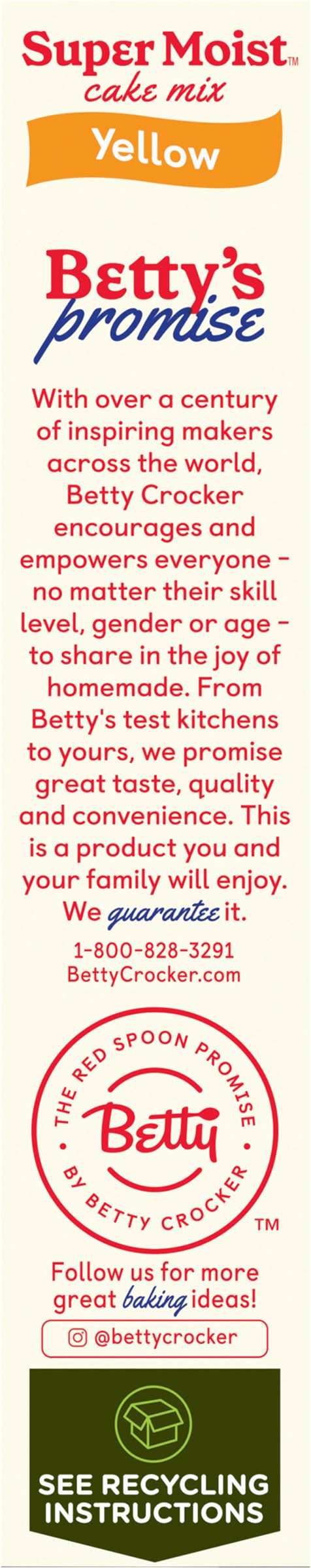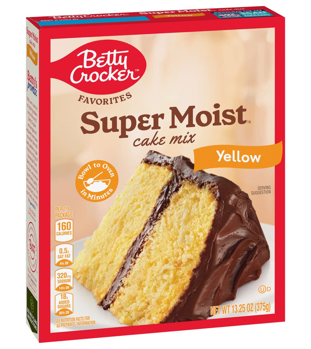 Serve up smiles by baking a cake with the help of Betty Crocker! There's a reason it's America's #1 Cake Mix brand (based on 52 weeks of Nielsen sales data for dry cake mixes ending 4/05/25). With Betty Crocker Super Moist Yellow Cake Mix, all you need is oil, water, and eggs to bring this delectable yellow cake to life. In only a few minutes, you'll have this cake mix ready to bake in the oven. Keep your pantry stocked so you have a box on hand whenever you need to spark some joy or togetherness. For more than a century, Betty Crocker has been a popular creator of easy, delicious recipes. Today, the Betty Crocker kitchen is still providing convenient, tasty dessert mixes, frostings, and convenient meal options and side dishes. • Flavor: Yellow • Packaging: Reusable