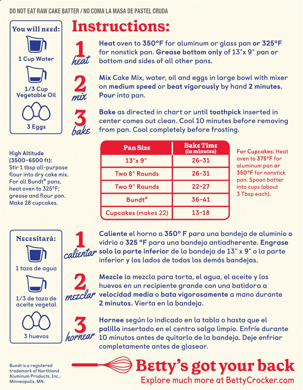 Directions: you will need: 1 cup water; 1/3 cup vegetable oil; 3 eggs. instructions: 1. heat oven to 350 degrees f for aluminum or glass pan or 325 degrees f for nonstick pan, grease bottom only of 13 inches x 9 inches pan or bottom and sides of all other pans, 2. mix cake mix, water, oil and eggs in large bowl with mixer on medium speed or beat vigorously by hand 2 minutes, pour into pan. 3. bake as directed in chart or until toothpick inserted in center comes out clean, cool 10 minutes before removing from pan, cool completely before frosting. pan size: 13 inches x 9 inches; bake time (in minutes): 26-31. pan size: two 8 inches rounds; bake time (in minutes): 26-31. pan size: two 9 inches rounds; bake time (in minutes): 22-27. pan size: bundt; bake time (in minutes): 36-41. pan size: cupcakes (makes 22); bake time (in minutes): 13-18. for cupcakes: heat oven to 375 degrees f for aluminum pan or 350 degrees f for nonstick pan. spoon batter into cups (about 3 tbsp each). high altitude (3500-6500 ft): stir 1 tbsp all-purpose flour into dry cake mix. for all bundt pans, heat oven to 325 degrees f; grease and flour pan. make 28 cupcakes. do not eat raw cake batter.