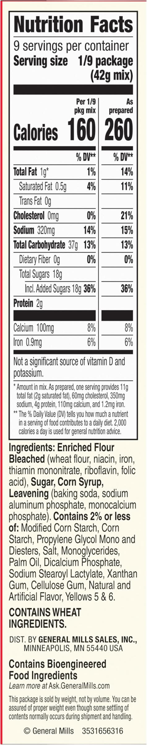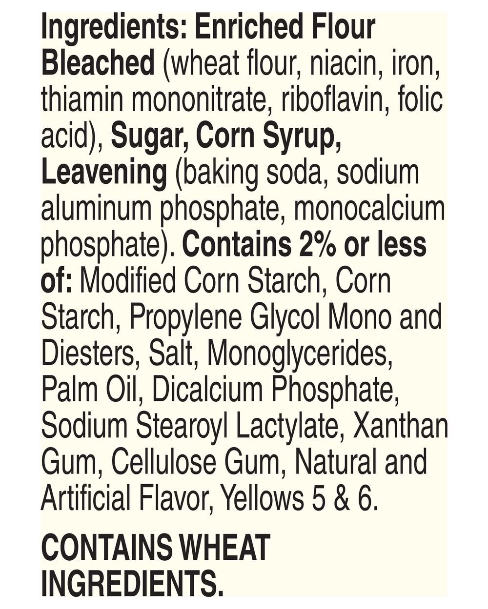 Ingredients: Enriched Flour Bleached (Wheat Flour, Niacin, Iron, Thiamin Mononitrate, Riboflavin, Folic Acid), Sugar, Corn Syrup, Leavening (Baking Soda, Sodium Aluminum Phosphate, Monocalcium Phosphate). Contains 2% or Less of: Modified Corn Starch, Corn Starch, Propylene Glycol Mono and Diesters, Salt, Monoglycerides, Palm Oil, Dicalcium Phosphate, Sodium Stearoyl Lactylate, Xanthan Gum, Cellulose Gum, Natural and Artificial Flavor, Yellows 5 & 6 Contains: Wheat
