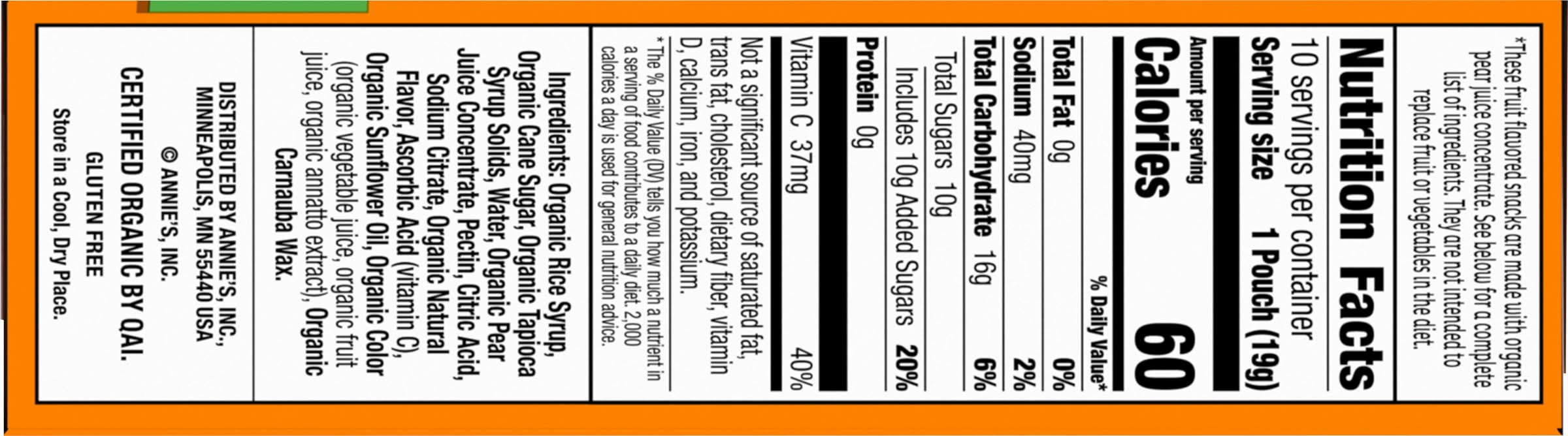 Ingredients: Organic Rice Syrup, Organic Cane Sugar, Organic Tapioca Syrup Solids, Water, Organic Pear Juice Concentrate, Pectin, Citric Acid, Sodium Citrate, Organic Natural Flavor, Ascorbic Acid (Vitamin C), Organic Sunflower Oil, Organic Color (Organic Vegetable Juice, Organic Fruit Juice, Organic Annatto Extract), Organic Carnauba Wax