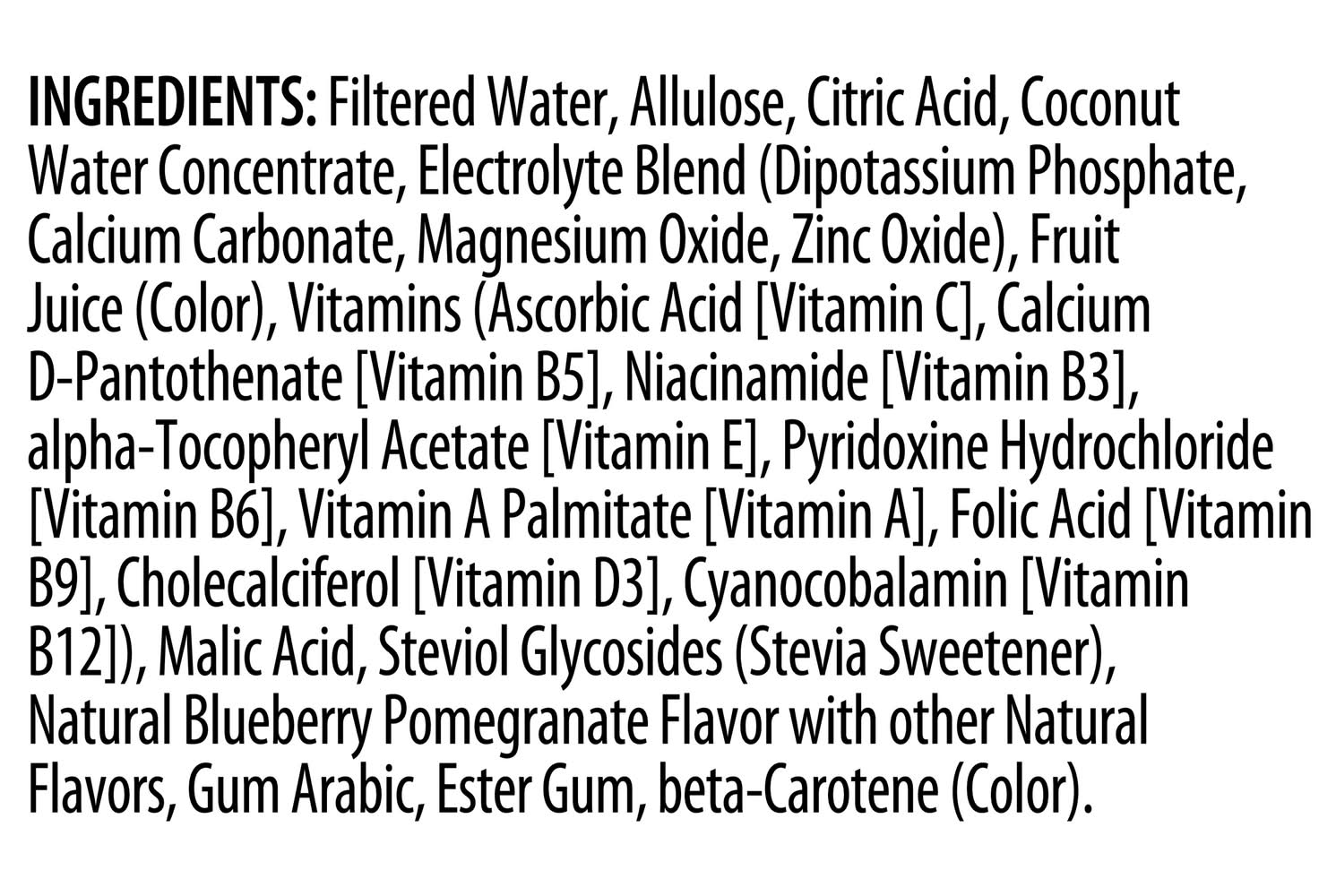 Ingredients: Filtered Water, Allulose, Citric Acid, Coconut Water Concentrate, Electrolyte Blend (Dipotassium Phosphate, Calcium Carbonate, Magnesium Oxide, Zinc Oxide), Fruit Juice (Color), Vitamins (Ascorbic Acid [Vitamin C], Calcium D-Pantothenate [Vitamin B5], Niacinamide [Vitamin B3], Alpha-Tocopheryl Acetate [Vitamin E], Pyridoxine Hydrochloride [Vitamin B6], Vitamin A Palmitate [Vitamin a], Folic Acid [Vitamin B9], Cholecalciferol [Vitamin D3], Cyanocobalamin [Vitamin B12], Malic Acid, Steviol Glycosides (Stevia Sweetener), Natural Blueberry Pomegranate Flavor with Other Natural Flavors, Gum Arabic, Ester Gum, Beta-Carotene (Color)