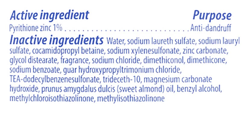 Ingredients: Active Ingredients: Pyrithione Zinc (1 %), Anti-dandruff. Inactive Ingredients: Water, Sodium Laureth Sulfate, Sodium Lauryl Sulfate, Cocamidopropyl Betaine, Sodium Xylenesulfonate, Zinc Carbonate, Glycol Distearate, Fragrance, Sodium Chloride, Dimethiconol, Dimethicone, Sodium Benzoate, Guar Hydroxyproplytrimonium Chloride, TEA-Dodecylbenzenesulfonate, Trideceth-10, Magnesium Carbonate Hydroxide, Prunus Amygdalus Dulcis (Sweet Almond) Oil, Benzyl Alcohol, Methylchloroisothiazolinone, Methylisothiazolinone Additives: Inactive Ingredients: Water, Sodium Laureth Sulfate, Sodium Lauryl Sulfate, Cocamidopropyl Betaine, Sodium Xylenesulfonate, Zinc Carbonate, Glycol Distearate, Fragrance, Sodium Chloride, Dimethicone, Sodium Benzoate, Guar Hydroxyproplytrimonium Chloride, TEA-Dodecylbenzenesulfonate, Trideceth-10, Magnesium Carbonate Hydroxide, Prunus Amygdalus Dulcis (Sweet Almond) Oil, Benzyl Alcohol, Methylchloroisothiazolinone, Methylisothiazolinone