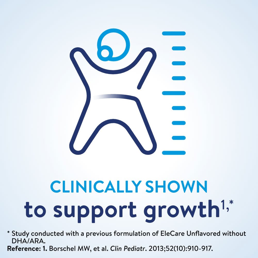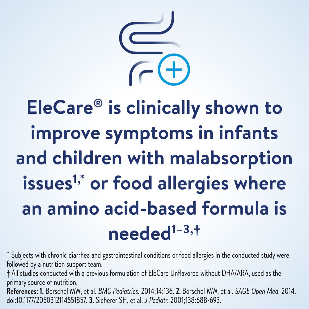 For nutritional complete. For oral and tube feeding not for iv use. Elecare jr: ages 1 and up. Amino acid-based for those who cannot tolerate milk, soy or protein hydrolysate formulas. • Size: 0-12 Months • Abbott Labs, Columbus, OH 43219-3034