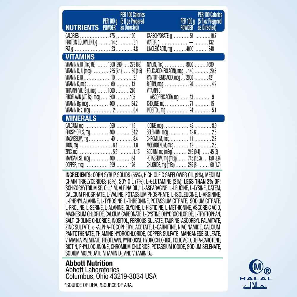 Ingredients: Corn Syrup Solids (55%), High Oleic Safflower Oil (9%), Medium Chain Triglycerides (8%), Soy Oil (7%), L-Glutamine (2%); Less than 2% of: C, Cohnii Oil M, Alpina Oil L-Asparagine, L-Leucine, L-Lysine Acetate, Oaten, Calcium Phosphate, L-Valine, Potassium Phosphate, L-Isoleucine, L-Arginine, L-Phenylalanine, L-Tyrosine, L-Threonine, Potassium Citrate, Sodium Citrate, L-Proline, L-Serine, L-Alanine, Glycine, L-Histidine, L-Methionine, Ascorbic Acid, Magnesium Chloride, Calcium Carbonate, L-Cystine Dihydrochloride, 1-Tryptophan, Salt, Choline Chloride, Inositol, Ferrous Sulfate, Taurine, Ascorbyl Palmitate, Zinc Sulfate, DL-Alpha-Tocopheryl Acetate, L-Carnitine, Niacinamide, Calcium Pantothenate, Thiamine Hydrochloride, Copper Sulfate, Manganese Sulfate, Vitamin A Palmitate, Riboflavin, Pyridoxine Hydrochloride, Folic Acid, Beta-Carotene, Biotin, Phylloquinone, Chromium Chloride, Potassium Iodide, Sodium Selenate, Sodium Molybdate, Vitamin D3 and Vitamin B12 Contains: Soybeans