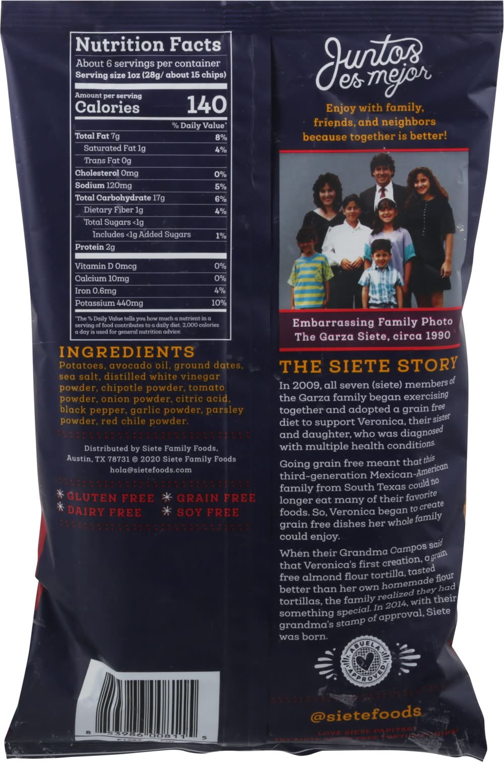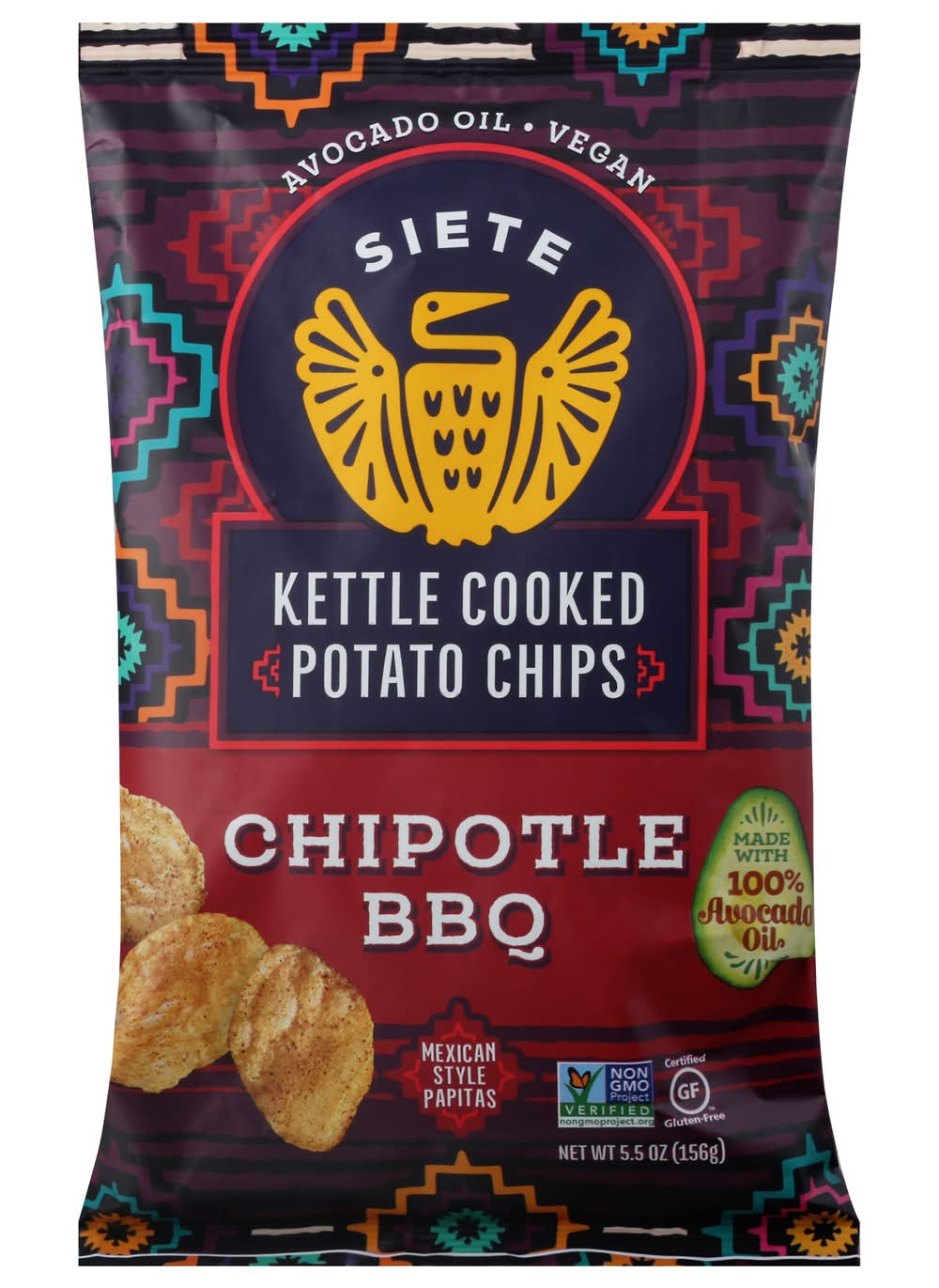 Mexican style papitas. Avocado oil. Enjoy with family, friends, and neighbors because together is better. • Flavor: Chipotle bbq • Siete Family Foods, Austin,TX,78731