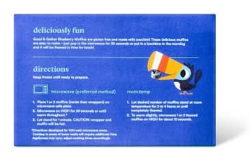 Treat the whole family to a tasty breakfast or snack option with these Frozen Blueberry Muffins made with zucchini and blueberries from Good & Gather™. Each of these six muffins is gluten-free to accommodate those with dietary restrictions, is made without artificial flavors or preservatives, and zucchini is the first ingredient. Store the muffins in the freezer until you’re ready to eat them, then simply thaw them or pop them in the microwave for 30 seconds and voila! They’re the perfect treat for hectic days or mornings when you don’t have time to cook for yourself or your kids.DirectionsKeep frozen until ready to prepare.Microwave (Preferred Method)1. Place 1 or 2 muffins (inside their wrappers) on microwave-safe plate.2. Microwave on HIGH for 30 seconds or until warm throughout.**3. Let stand for 1 minute. CAUTION: wrapper and muffin will be hot.**Directions developed for 1100 watt microwave ovens. Cooking in ovens of lower watts will require additional time. Appliances may vary; adjust heating time accordingly.Room Temp1. Let desired number of muffins stand at room temperature for 2 to 4 hours or until completely thawed.2. To warm slightly, microwave 1 or 2 thawed muffins on HIGH for about 10 seconds." Every product that carries the Good & Gather™ name starts with quality ingredients that deliver great taste, making it easier for you and your family to eat well, every day. We promise you’ll love each bite, or your money back. All Good & Gather products are made without artificial flavors, synthetic colors, artificial sweeteners, and high-fructose corn syrup. Some are specially formulated while others never contained these ingredients. Flavor: Blueberry