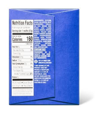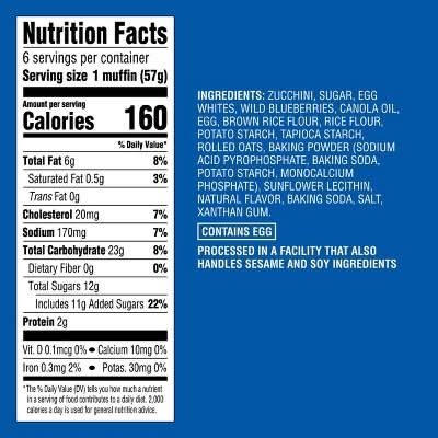 Ingredients: Zucchini, Sugar, Egg Whites, Wild Blueberries, Canola Oil, Egg, Brown Rice Flour,, Rice Flour, Potato Starch, Tapioca Starch, Rolled Oats, Baking Powder (Sodium, Acid Pyrophosphate, Baking Soda, Potato Starch, Monocalcium Phosphate),, Sunflower Lecithin, Natural Flavor, Baking Soda, Salt, Xanthan Gum.