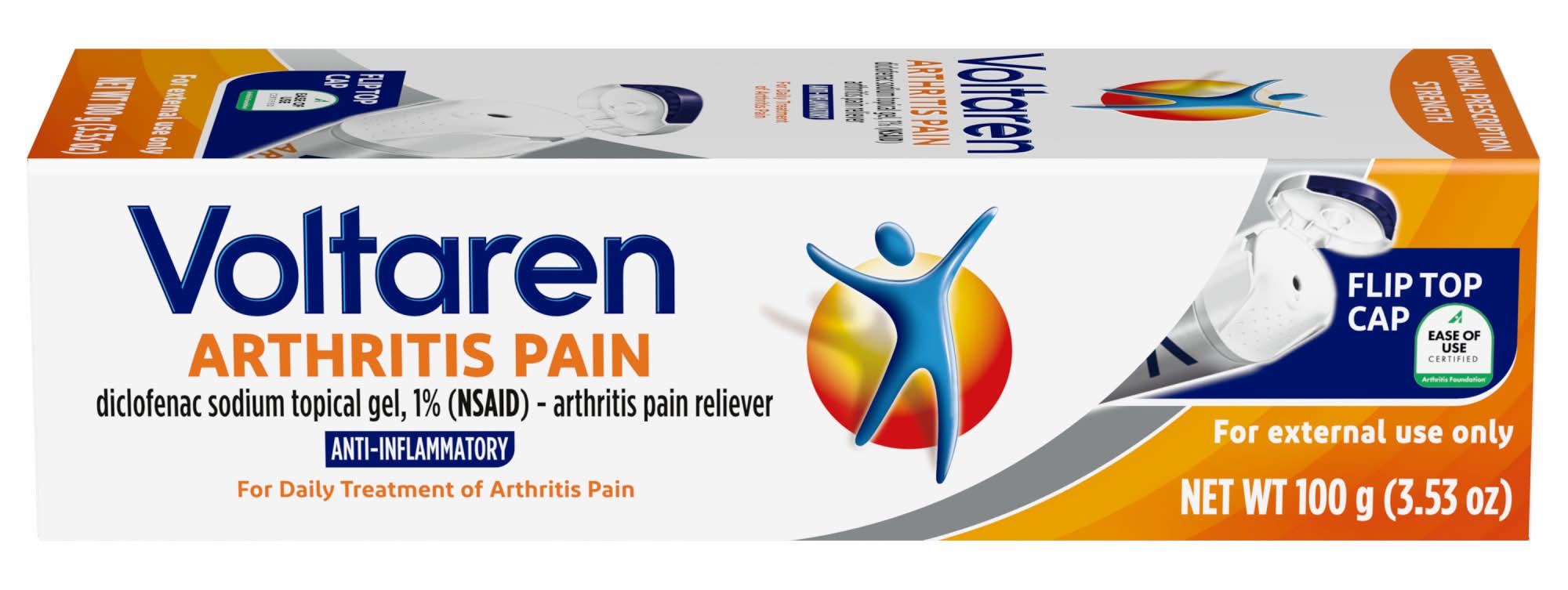 Same great product, now with an easy open cap! Our topical gel products (100G+) now come with an easy to open flip cap that can be opened with just one hand! Simply pop open the flip cap with your palm, fingers, or even a firm household surface, like the edge of a table. The #1 doctor recommended OTC topical pain relief brand, Voltaren is approved for arthritis pain. Voltaren has a triple effect that relieves arthritis pain, improves mobility and reduces stiffness to provide prescription-strength arthritis joint pain relief over the counter. Containing diclofenac sodium, this topical nonsteroidal anti-inflammatory drug is an alternative to pain pills that can be applied on up to two joints, delivering powerful topical arthritis pain relief in your hands, wrists, elbows, feet, ankles and knees. This arthritis pain reliever is formulated with non-greasy Voltaren Emulgel, which combines the properties of an arthritis pain relief cream and a gel, to penetrate deep below the surface of the skin and attack pain at the site. You should feel significant pain relief within seven days of continuous use of Voltaren Arthritis Pain Gel, giving you the freedom to live your life and the ability to be there for those you love. Voltaren is paraben and dye-free and treats pain, giving you control to keep moving when arthritis pain strikes and providing long lasting relief to enjoy everyday activities uninterrupted, when applied four times a day. Use for up to 21 days. In clinical studies, patients with osteoarthritis of the knee demonstrated a statistically significant improvement in pain (vs. a placebo) with this nonsteroidal anti-inflammatory pain relief gel starting at 1 week that was sustained through 12 weeks of treatment. Take on the day from first thing in the morning until bedtime with the powerful topical pain relief of Voltaren. Packaging may vary. GSK Consumer Healthcare, Warren,NJ,07059