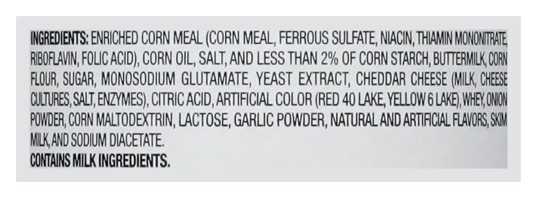 Ingredients: Enriched Corn Meal (Corn Meal, Ferrous Sulfate, Niacin, Thiamin Mononitrate, Riboflavin, Folic Acid), Corn Oil, Salt, and Less than 2% of Corn Starch, Buttermilk, Corn Flour, Sugar, Monosodium Glutamate, Yeast Extract, Cheddar Cheese (Milk, Cheese Cultures, Salt, Enzymes), Citric Acid, Artificial Color (Red 40 Lake, Yellow 6 Lake), Whey, Onion Powder, Corn Maltodextrin, Lactose, Garlic Powder, Natural and Artificial Flavors, Skim Milk, and Sodium Diacetate Contains: Milk, Lactose