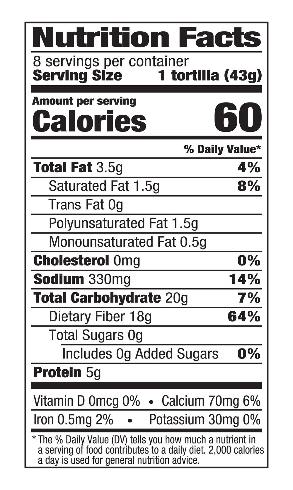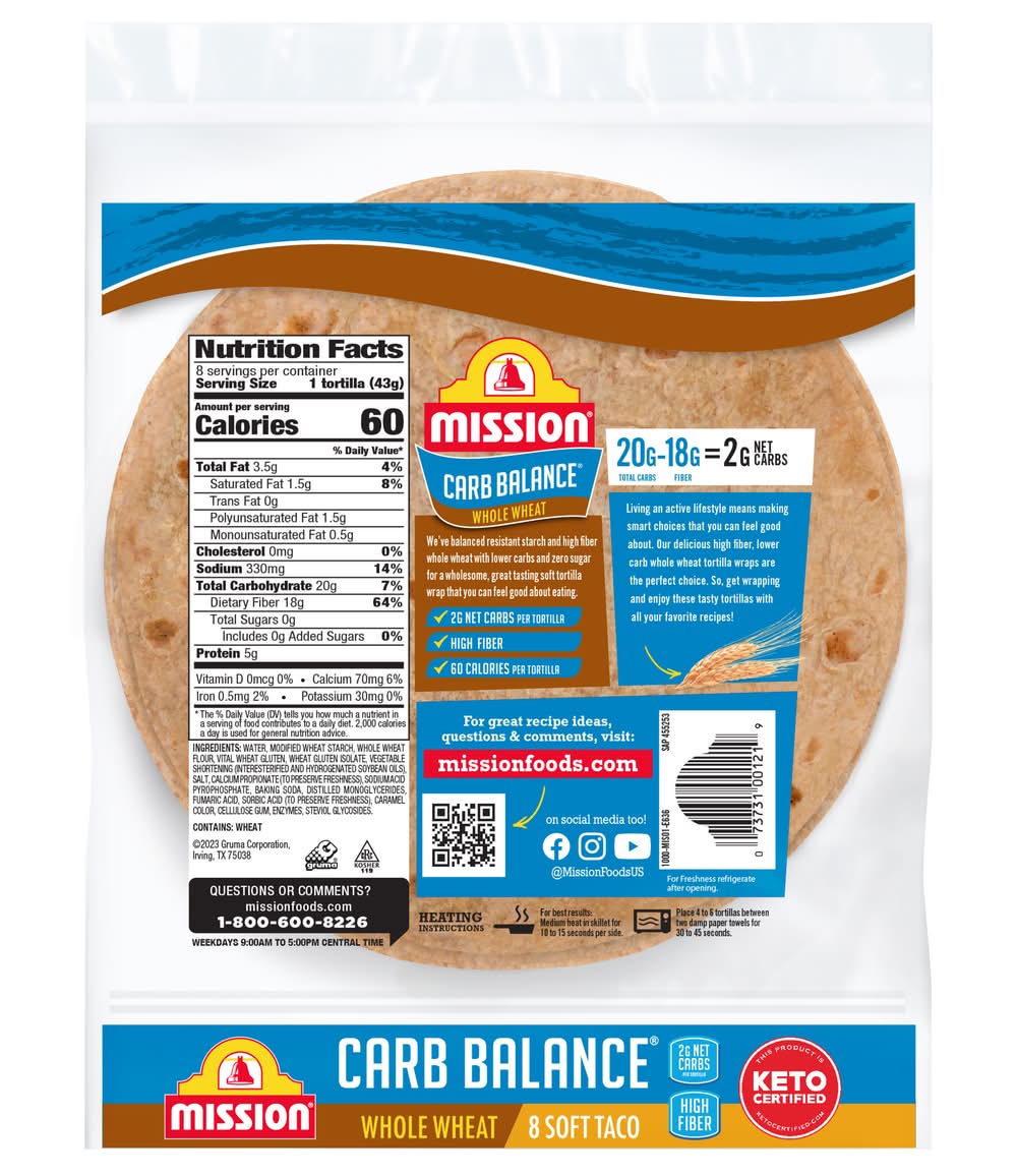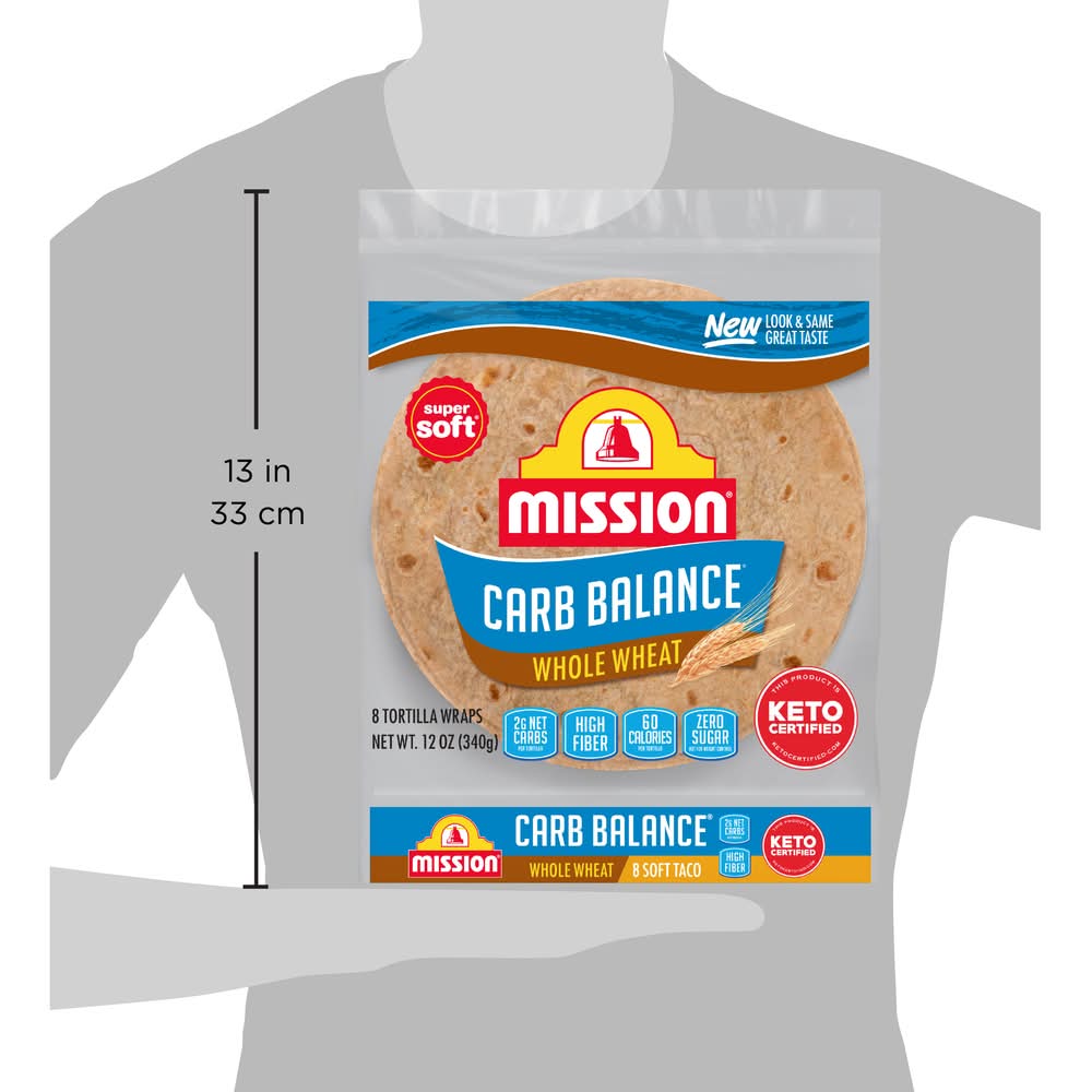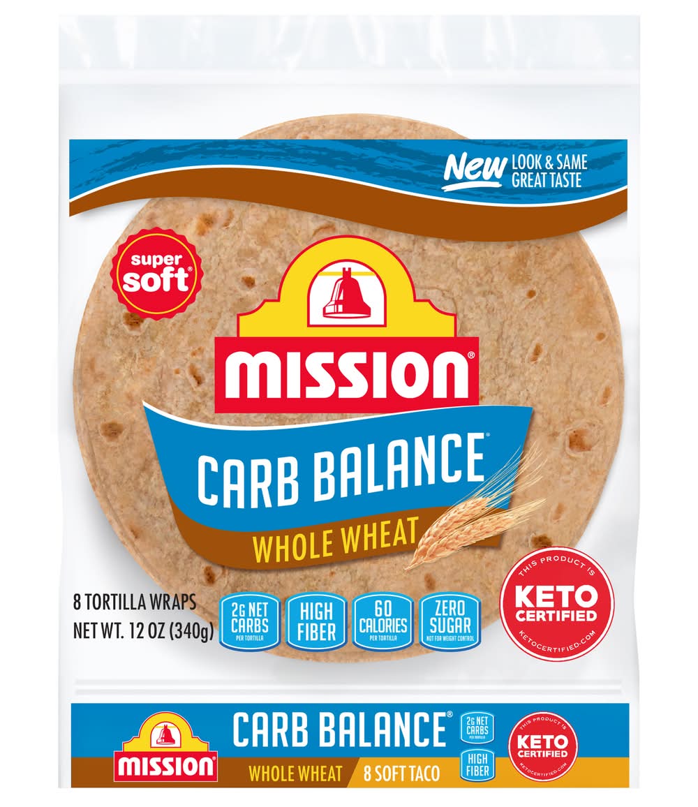 Mission Carb Balance Soft Taco Whole Wheat Tortillas have the supremely soft texture and great taste you want, but without all the carbs you don't. You can feel good about serving our tortillas to your friends and family because they contain 2g of net carbohydrates and zero sugar per serving. They're also cholesterol free and are an excellent source of dietary fiber. Whether you’re seeking a balanced diet or enjoy experimenting with new ingredients, our extreme low carb tortillas are versatile enough to use in all of your favorite recipes. We recommend filling them with grilled salmon, mashed avocado, and fresh arugula for a quick and delicious dinner. Includes one 8-count package of Mission Carb Balance Soft Taco Whole Wheat Tortillas.