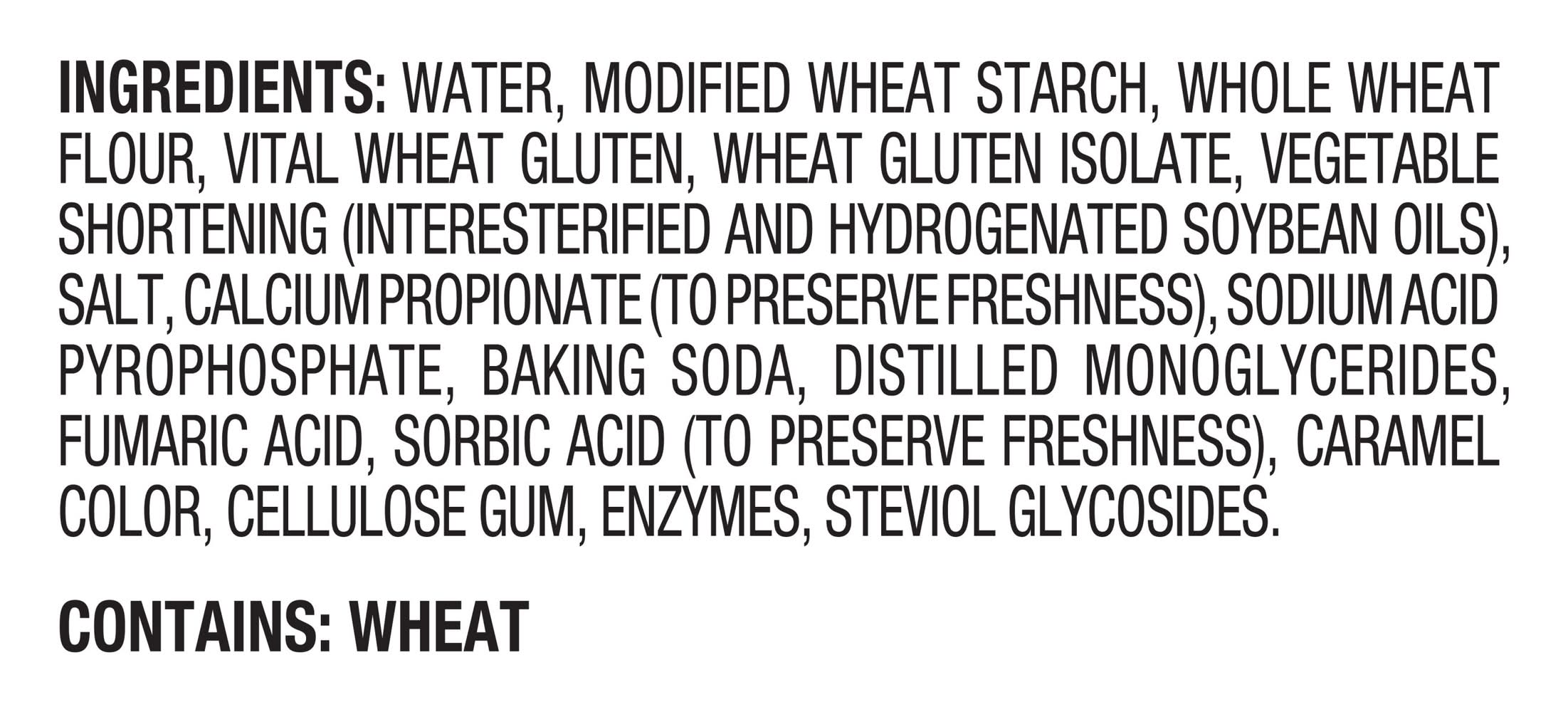 Ingredients: Water, modified wheat starch, whole wheat flour, vital wheat gluten, wheat gluten isolate, vegetable shortening (interesterified and hydrogenated soybean oils), salt, calcium propionate (to preserve freshness), sodiumacid pyrophosphate, baking soda, distilled monoglycerides, fumaric acid, sorbic acid (to preserve freshness), caramel color, cellulose gum, enzymes, steviol glycosides. Contains: Wheat