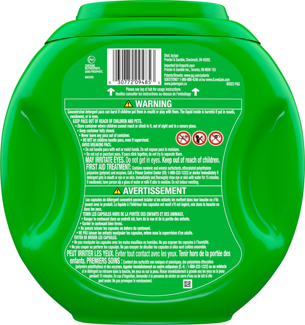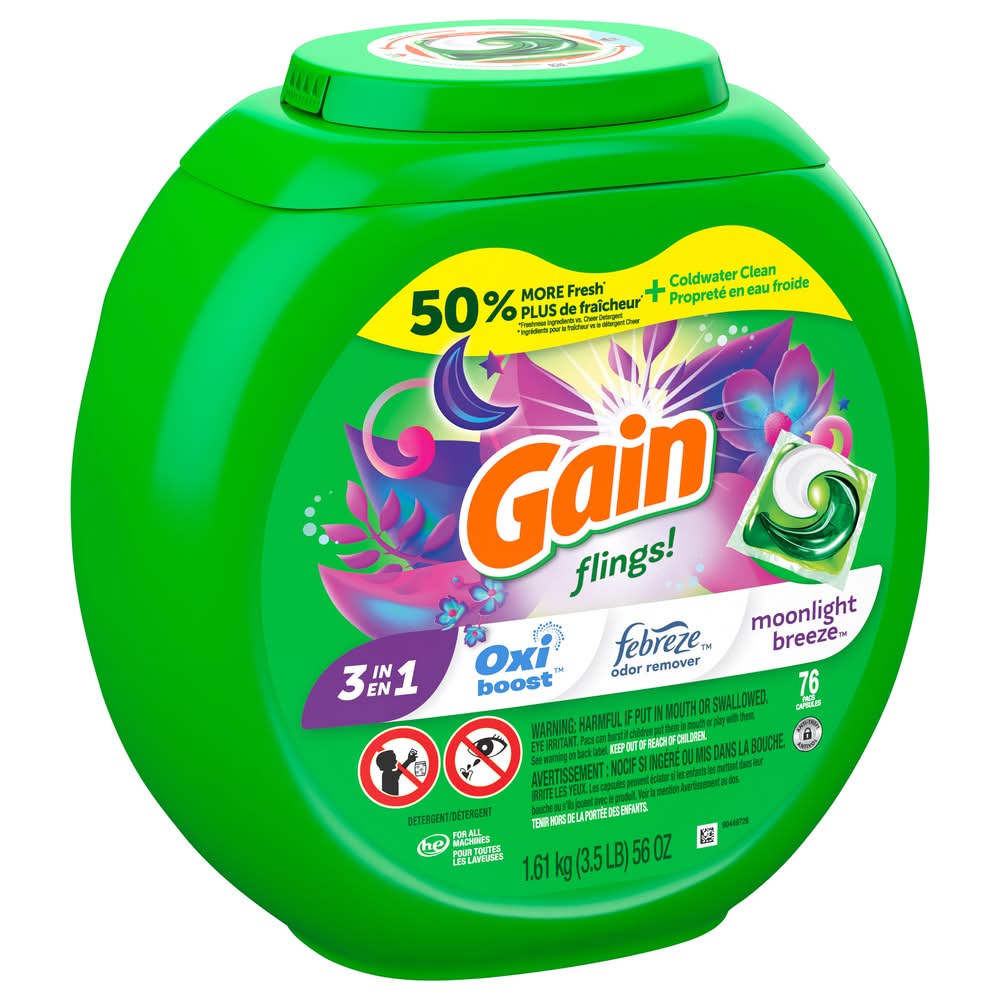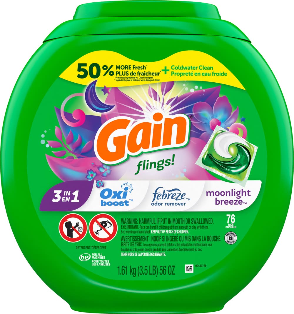 50 % more fresh (Freshness ingredients vs. cheer detergent) + coldwater clean. Flings! 3 in 1. Oxi Boost. Febreze odor remover. Anti-theft. Contains no phosphate. Please usage instructions. HE. For all machines. www.iLoveGain.com. Questions? 1-800-888-4246 or www.Ilovegain.com. Child Lock.