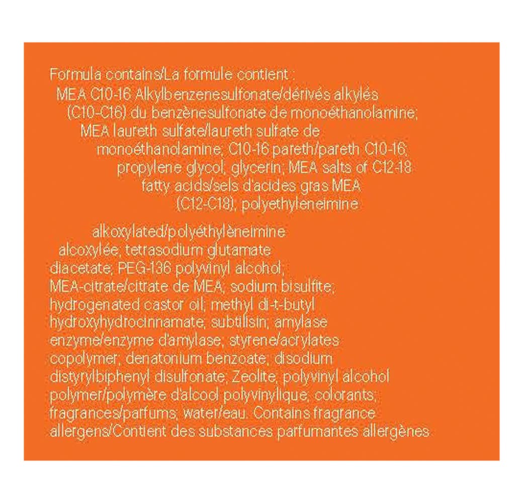 Ingredients: Formula Contains/La Formule Contient MEA C10-16 Alkylbenzenesulfonate/Derives Alkyles (C10-C16) Du Benzenesulfonate De Monoethanolamine, MEA Laureth Sulfate/Laureth Sulfate De Monoethanolamine, C10-16 Pareth/Pareth C10-16, Propylene Glycol, Glycerin, MEA Salts of C12-18 Fatty Acids/Sels D'acides Gras MEA (C12-C18), Polyethyleneimine Alkoxylated/Polyethylenelmine Alcoxylee, Tetrasodium Glutamate Diacetate, PEG-136 Polyvinyl Alcohol, MEA-Citrate/Citrate De MEA, Sodium Bisulfite, Hydrogenated Castor Oil; Methyl Di-T-Butyl Hydroxyhydrocinnamate, Subtilisin, Amylase Enzyme/Enzyme D'amylase, Styrene/Acrylates Copolymer, Denatonium Benzoate, Disodium Distyrylbiphenyl Disulfonate; Zeolite, Polyvinyl Alcohol Polymer/Polymere D'alcod Polyvinylique, Colorants, Fragrances/Parfums Water/Eau Contains: Sulfites