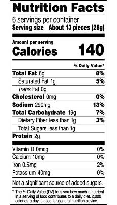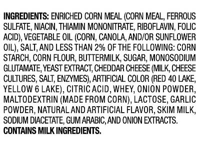 Ingredients: 'ENRICHED CORN MEAL (CORN MEAL, FERROUS SULFATE, NIACIN, THIAMIN MONONITRATE, RIBOFLAVIN, AND FOLIC ACID), VEGETABLE OIL (CORN, CANOLA, AND/OR SUNFLOWER OIL), SALT, AND LESS THAN 2% OF THE FOLLOWING: CORN STARCH, CORN FLOUR, BUTTERMILK, SUGAR, MONOSODIUM GLUTAMATE, YEAST EXTRACT, CHEDDAR CHEESE [MILK, CHEESE CULTURES, SALT, ENZYMES]