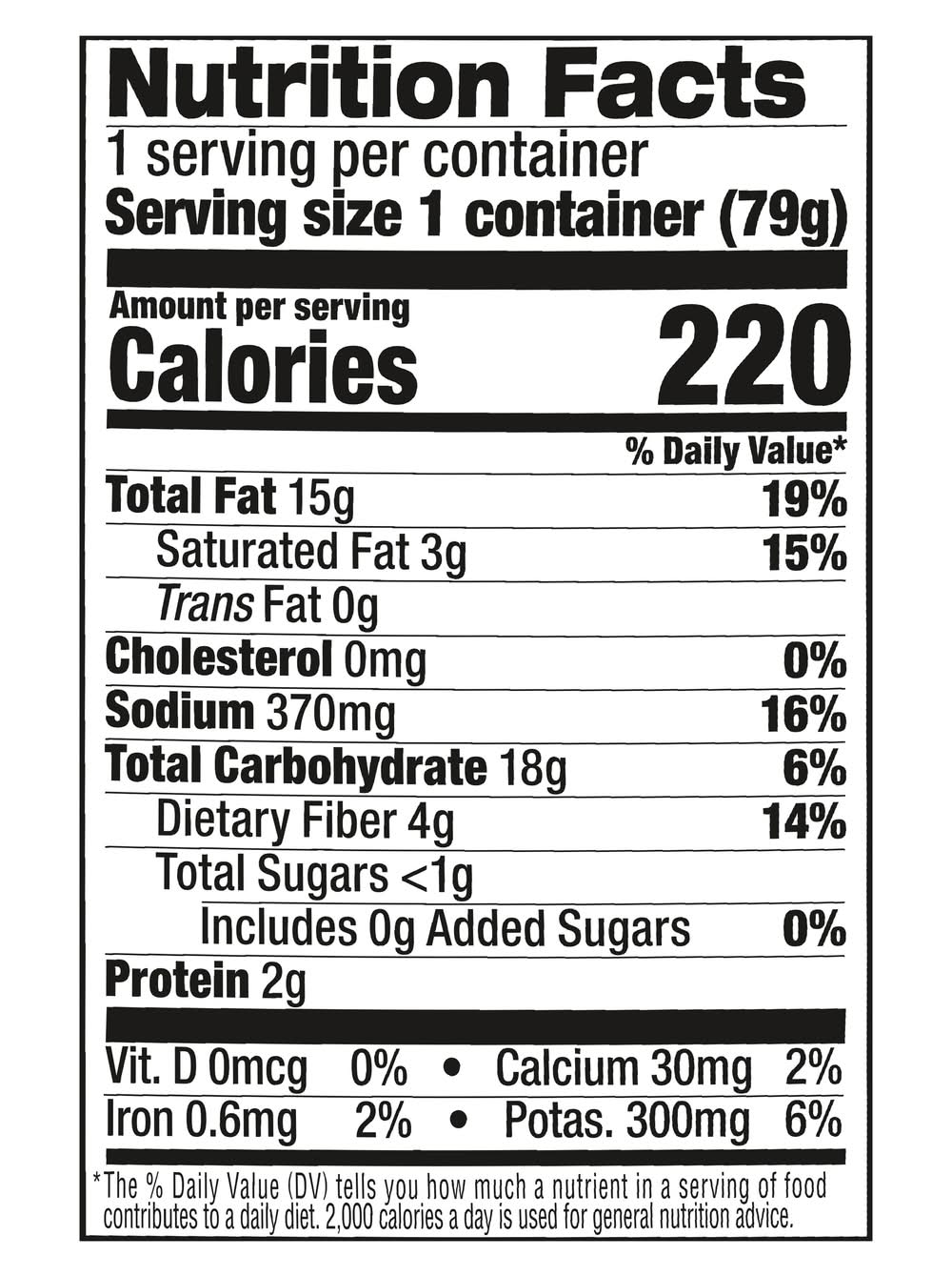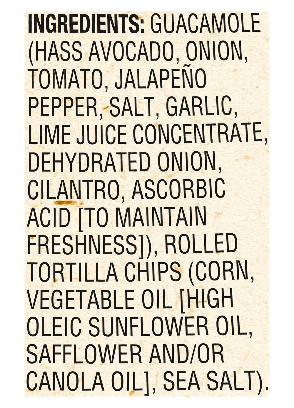Ingredients: Guacamole (Hass Avocado, Onion, Tomato, Jalapeño Pepper, Salt, Garlic, Lime Juice Concentrate, Dehydrated Onion, Cilantro, Ascorbic Acid [to Maintain Freshness]), Rolled Tortilla Chips (Corn, Vegetable Oil [High Oleic Sunflower Oil, Safflower and/or Canola Oil], Sea Salt) Contains: Corn
