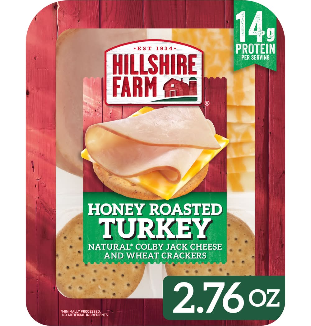 Elevate snack time and help fuel your busy day. Our Hillshire Farm Snack Kit contains high-quality Hillshire Farm honey roasted turkey breast slices, all-natural Colby Jack cheese and wheat crackers. Ideal as a snack or part of a meal, they are ready to eat right from the refrigerator. Each package contains 14 grams of protein for a filling, protein-packed snack. Great for on-the-go snacking, they are perfect for busy days, traveling, after a workout or any time you crave a quick and easy bite to eat. Keep our 2.76 oz single serve pack refrigerated until you're ready to enjoy. Flavor: Honey roasted turkey