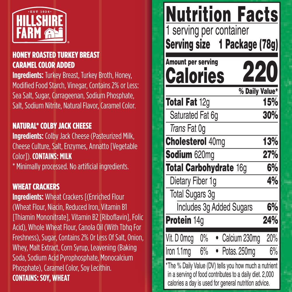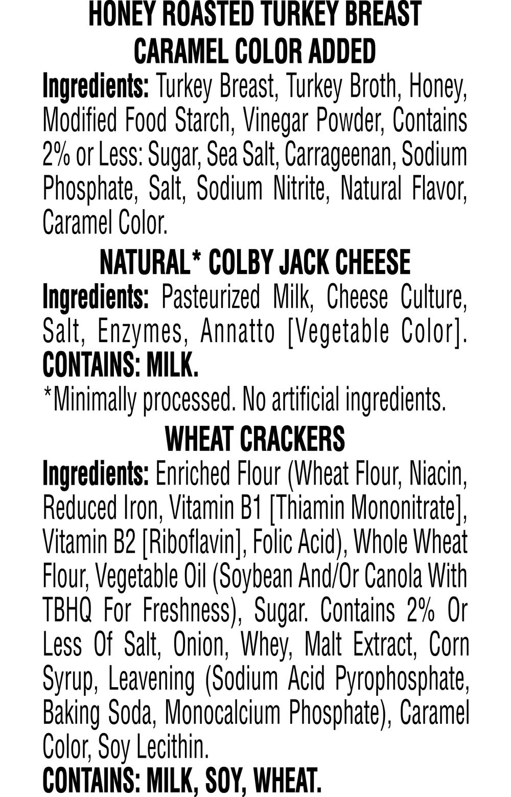 Ingredients: Honey Roasted Turkey Breast Caramel Color Added: Turkey Breast, Turkey Broth, Honey, Modified Food Starch, Vinegar Powder, Contains 2% or Less: Sugar, Sea Salt, Carrageenan, Sodium Phosphate, Salt, Sodium Nitrite, Natural Flavor, Caramel Color. Natural* Colby Jack Cheese Ingredients: Pasteurized Milk, Cheese Culture, Salt, Enzymes, Annatto [Vegetable Color]. Wheat Crackers Ingredients: Enriched Flour (Wheat Flour, Niacin, Reduced Iron, Vitamin B1 (Thiamin Mononitrate], Vitamin B2 (Riboflavin), Folic Acid), Whole Wheat Flour, Vegetable Oil (Soybean and/or Canola with TBHQ for Freshness), Sugar, Contains 2% or Less of Salt, Onion, Whey, Malt Extract, Corn Syrup, Leavening (Sodium Acid Pyrophosphate, Baking Soda, Monocalcium Phosphate), Caramel Color, Soy Lecithin. *Minimally Processed, No Artificial Ingredients Contains: Milk, Soybeans, Wheat