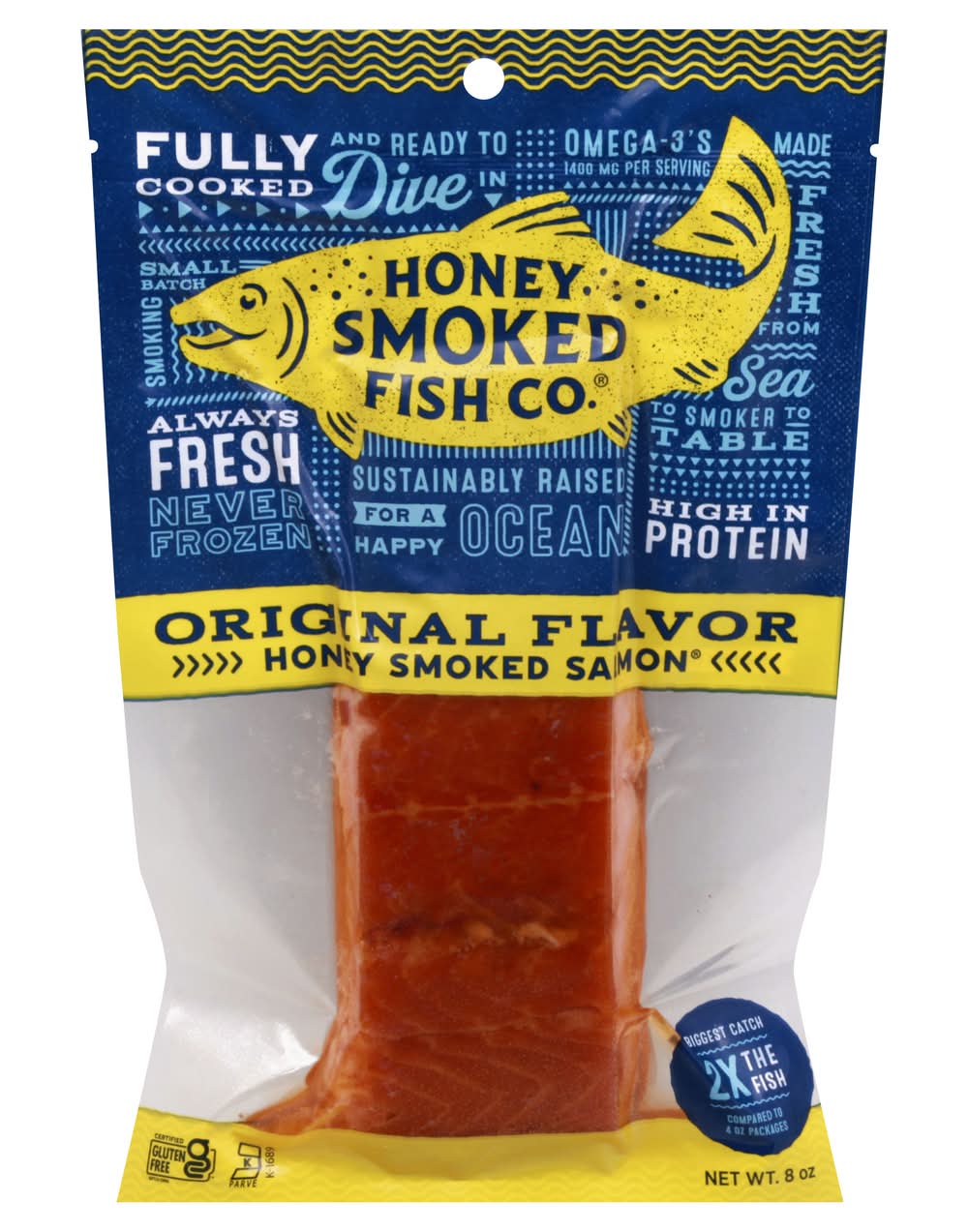 Honey-smoked smoked salmon fillet that is fresh, cooked and read to eat. Our salmon is never frozen, and uses hot smoke from honey-coated 100% hickory. Our one-of-a-kind, salmon is fully cooked shortly after leaving the water and sealed tight as soon as it exits the small-batch smoker. *13 grams protein per serving *1600 mg omega-3 per serving *Certified gluten free *Small batch smoked *Fresh, never frozen For best flavor, remove from refrigerator and package 25 minutes prior to serving. Keep refrigerated at or below 38℉. Use within 5 days of opening. Can be frozen up to 12 months. Flavor: Original