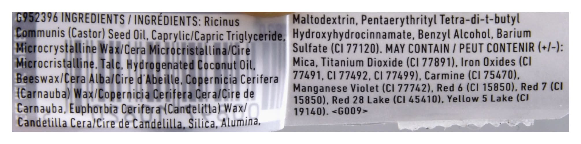 Ingredients: Ricinus Communis (Castor) Seed Oil, Caprylic/Capric Triglyceride, Microcrystalline Wax/Cera Microcristallina/Cire Microcristalline, Talc, Hydrogenated Coconut Oil, Beeswax/Cera Alba/Cire d'Abeille, Copernicia Cerifera (Carnauba) Wax/Copernicia Cerifera Cera/Cire De Carnauba, Euphorbia Cerifera (Candelilla) Wax/Candelilla Cera/Cire De Candelilla, Silica, Alumina, Maltodextrin, Pentaerythrityl Tetra-Di-T-Butyl Hydroxyhydrocinnamate, Benzyl Alcohol, Barium Sulfate (CI 77120), May Contain / Peut Contenir (+/-): Mica, Titanium Dioxide (CI 77891), Iron Oxides (CI 77491, CI 77492, CI 77499), Carmine (CI 75470), Manganese Violet (CI 77742), Red 6 (CI 15850), Red 7 (CI 15850), Red 28 Lake (CI 45410), Yellow 5 Lake (CI 19140) Contains: Tree Nuts