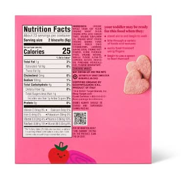 Give your toddler a great-tasting and easy-to-eat snack with these Organic Beetroot Biscuit Toddler Snacks from Good & Gather Intended for toddlers 12+ months who are starting to stand and walk on their own and can easily feed themselves with their hands or a spoon, these biscuits are made with organic beet powder. Plus, they have no synthetic colors or artificial flavors. These non-GMO, USDA organic snacks are a handy option for at-home snacking or packing with you on the go. 12+ months: Your toddler may be ready for this food when they: • Stand alone, and begin to walk. • Bite through a variety of foods and textures. • Easily feed themselves using fingers. • Begin to use a spoon to feed themselves. Every product that carries the Good & Gather name starts with quality ingredients that deliver great taste, making it easier for you and your family to eat well every day. We promise you’ll love each bite or your money back. Size: 12 M+
