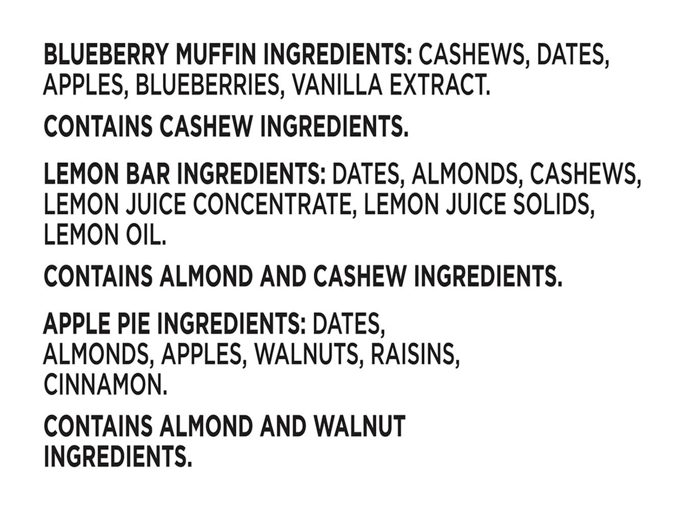 Ingredients: Blueberry Muffin: Cashews, Dates, Apples, Blueberries, Vanilla Extract. Lemon Bar: Dates, Almonds, Cashews, Lemon Juice Concentrate, Lemon Juice Solids, Lemon Oil. Apple Pie: Dates, Almonds, Apples, Walnuts, Raisins, Cinnamon. Contains: Tree Nuts, Cashews, Tree Nuts, Almonds, Tree Nuts, Walnuts/Butternuts