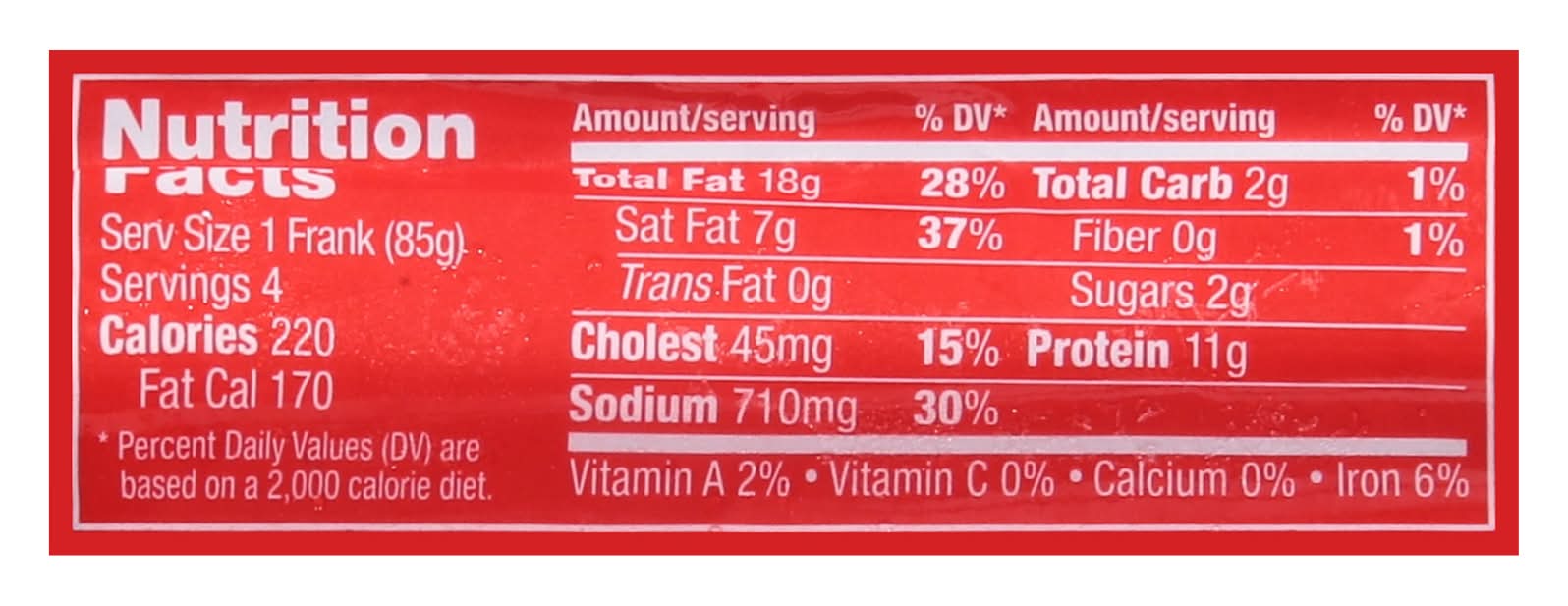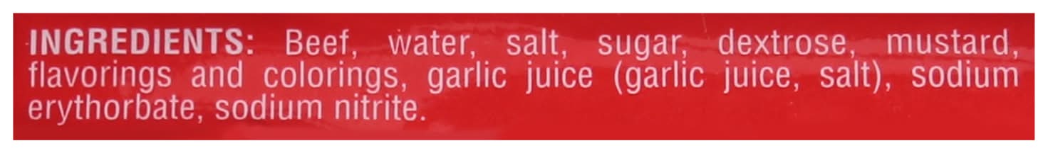 Ingredients: Beef, Water, Salt, Sugar, Dextrose, Mustard, Flavorings and Colorings, Garlic Juice (Garlic Juice, Salt), Sodium Erythorbate, Sodium Nitrite Contains: Mustard and its derivates