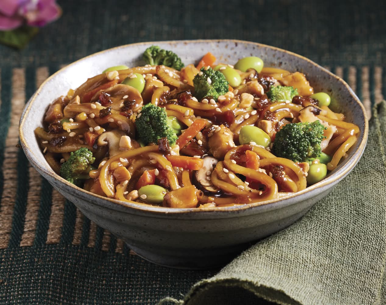 Ingredients: ORGANIC NOODLES (ORGANIC RICE FLOUR, FILTERED WATER, ORGANIC POTATO STARCH, ORGANIC SOY FLOUR, ORGANIC RICE STARCH), ORGANIC TOFU (FILTERED WATER, ORGANIC SOYBEANS, MAGNESIUM CHLORIDE), ORGANIC BROCCOLI, ORGANIC CABBAGE, ORGANIC TAMARI (WATER, ORGANIC SOYBEANS, SALT, ORGANIC ALCOHOL [TO PRESERVE FRESHNESS]), ORGANIC CANE SUGAR, ORGANIC YELLOW ONIONS, ORGANIC EDAMAME, ORGANIC CARROTS, EXPELLER PRESSED HIGH OLEIC SAFFLOWER AND/OR SUNFLOWER OIL, ORGANIC MUSHROOMS, ORGANIC SHIITAKE MUSHROOMS, ORGANIC GREEN ONIONS, ORGANIC GINGER PURÉE (ORGANIC GINGER, FILTERED WATER), FILTERED WATER, ORGANIC CASHEWS, ORGANIC BLACKSTRAP MOLASSES, ORGANIC GARLIC, SPICES, ORGANIC CORNSTARCH, ORGANIC TOASTED SESAME SEEDS, ORGANIC DISTILLED VINEGAR, SEA SALT, BLACK PEPPER.CONTAINS SOY, TREE NUTS (CASHEWS) AND SESAME. Contains: Soybeans, Tree Nuts, Cashews, Sesame, Corn, Wheat, Milk, Soybeans, Tree Nuts, Sesame