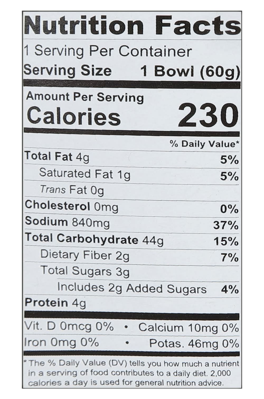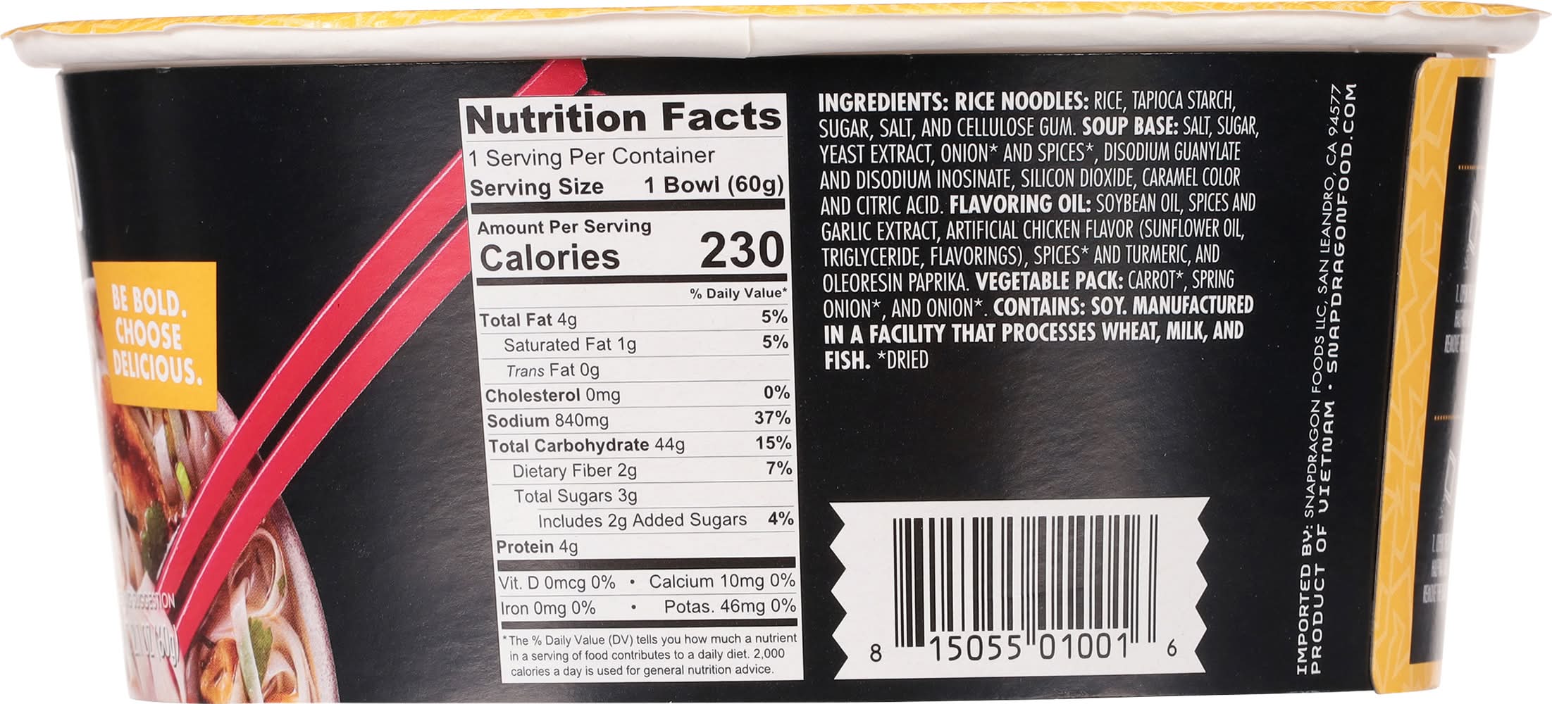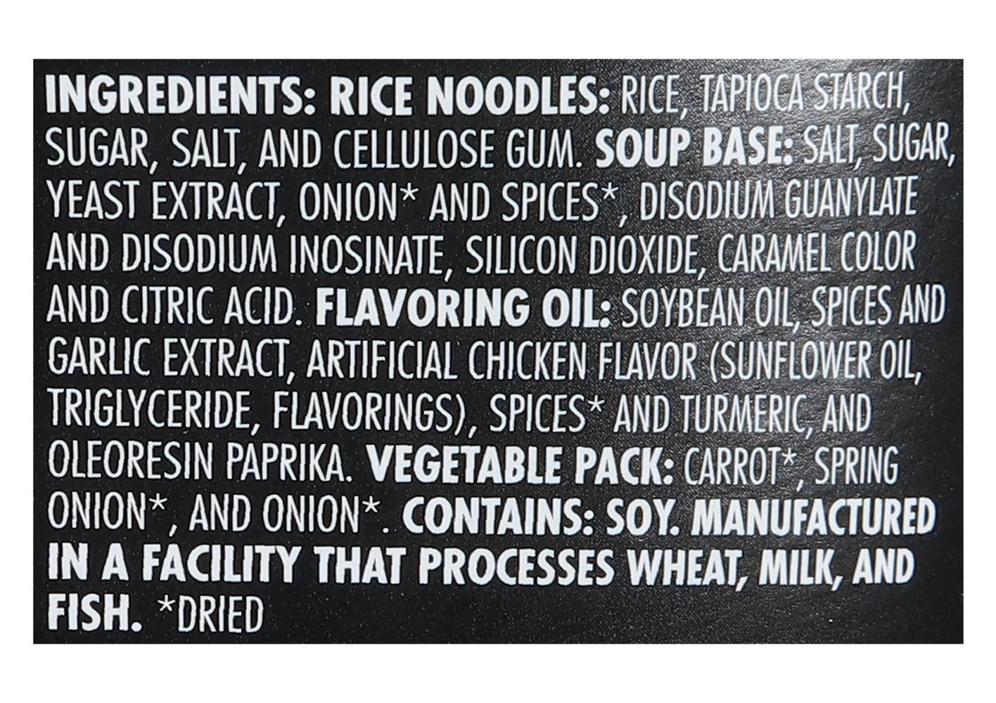 Ingredients: Rice Noodles: Rice, Tapioca Starch, Sugar, Salt, and Cellulose Gum. Soup Base: Salt, Sugar, Yeast Extract, Onion* and Spices*, Disodium Guanylate and Disodium Inosinate, Silicon Dioxide, Caramel Color and Citric Acid. Flavoring Oil: Soybean Oil, Spices and Garlic Extract, Artificial Chicken Flavor (Sunflower Oil, Triglyceride, Flavorings), Spices* and Turmeric, and Oleoresin Paprika, Vegetable Pack: Carrot*, Spring Onion*, and Onion*. *Dried Contains: Soybeans, Wheat, Milk, Fish