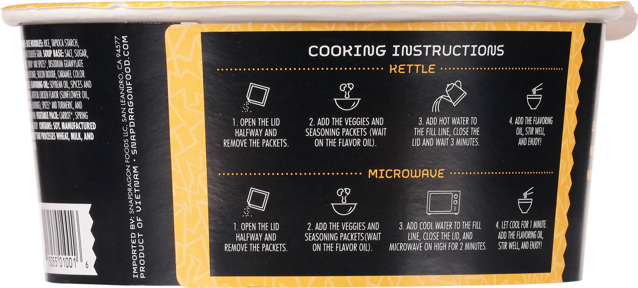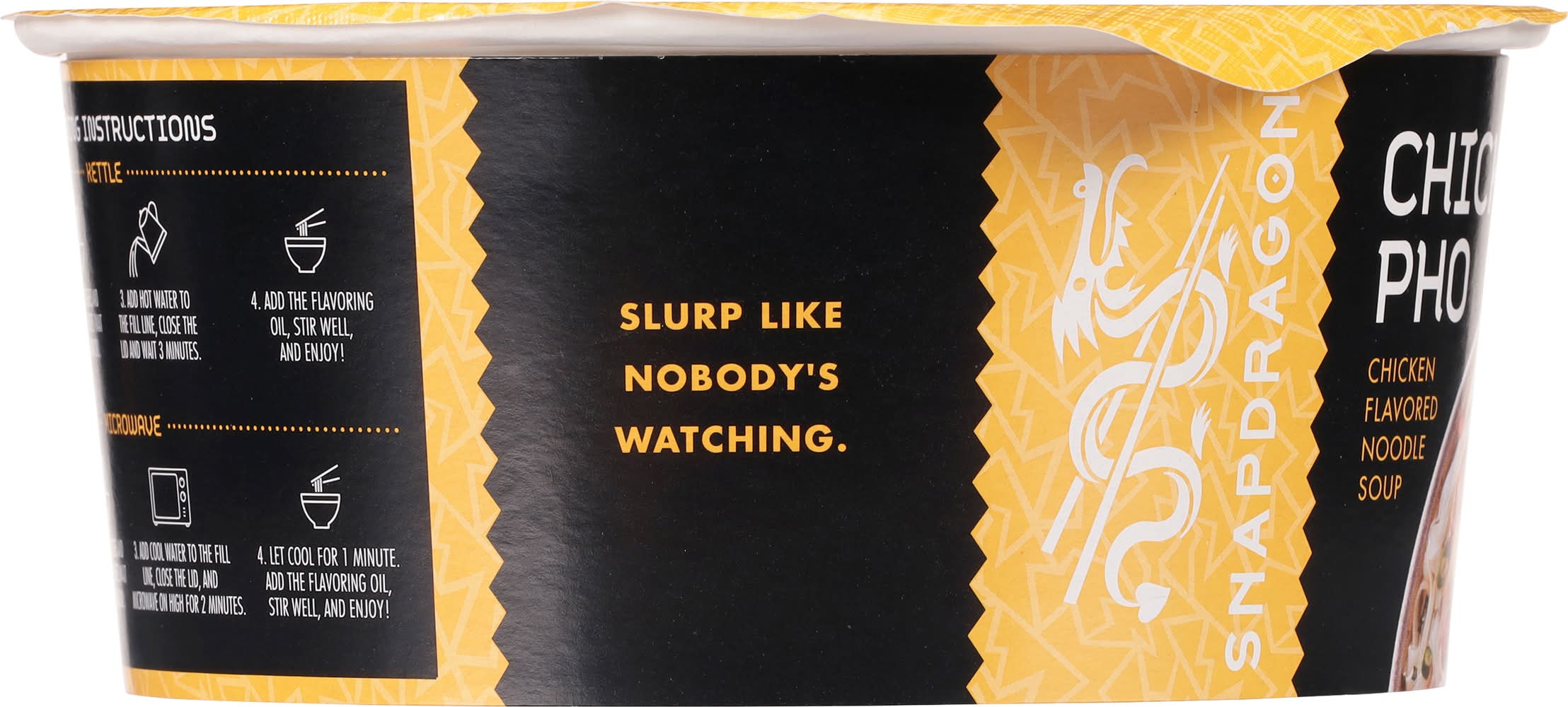 Cooking instructions: 1. pull back the lid half way and open packet. 2. place all desired contents except the flavoring oil packet in the bowl. 3. fill to line with near-boiling water and place lid back on. 4. wait 3 to 5 minutes until noodles are lender and have happy thoughts. 5. drizzle the flavoring oil, stir well and slurp like you’ve never slurped before. microwave: 1. remove the lid and open packets. 2. place all desired contents except the flavoring oil packet in the bowl. 3. fill to line with cold water. 4. microwave on high for 2 minutes, have happy thoughts, and let stand for 1 minute. 5. drizzle the flavoring oil, stir well and slurp like you’ve never slurped before.