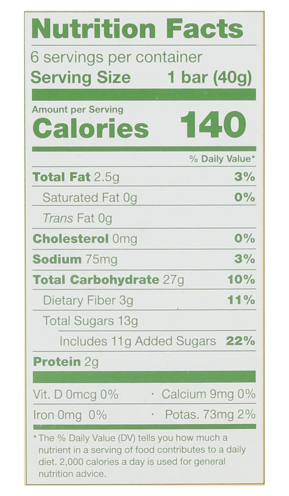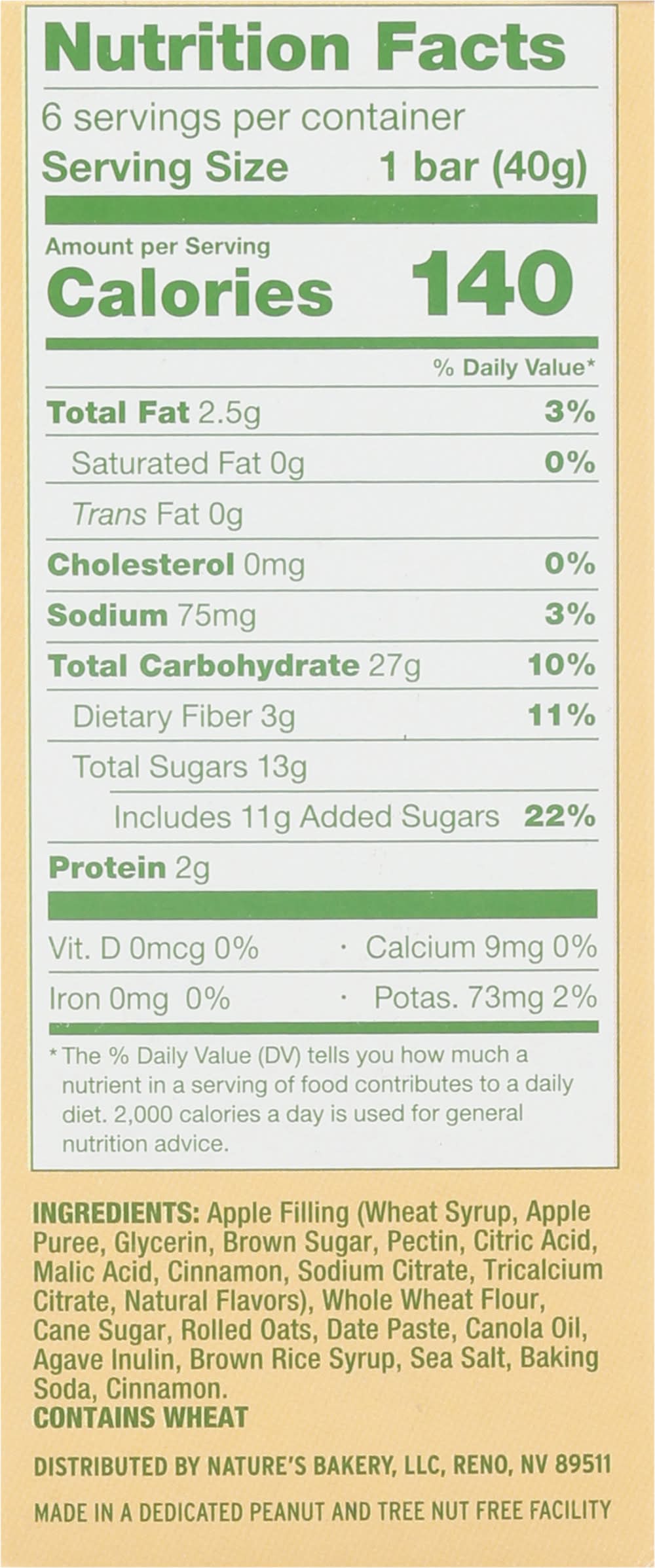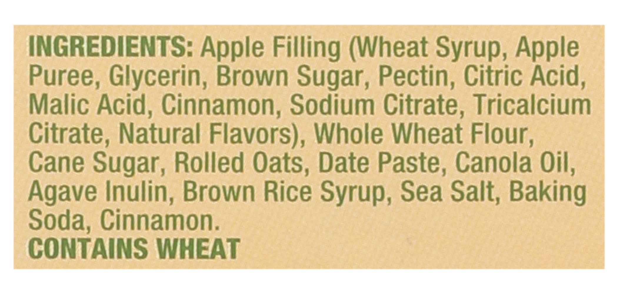 Ingredients: Apple Filling (Wheat Syrup, Apple Puree, Glycerin, Brown Sugar, Pectin, Citric Acid, Malic Acid, Cinnamon, Sodium Citrate, Tricalcium Citrate, Natural Flavors), Whole Wheat Flour, Cane Sugar, Rolled Oats, Date Paste, Canola Oil, Agave Inulin, Brown Rice Syrup, Sea Salt, Baking Soda, Cinnamon Contains: Wheat, Oat