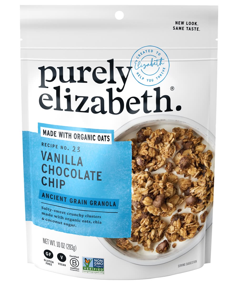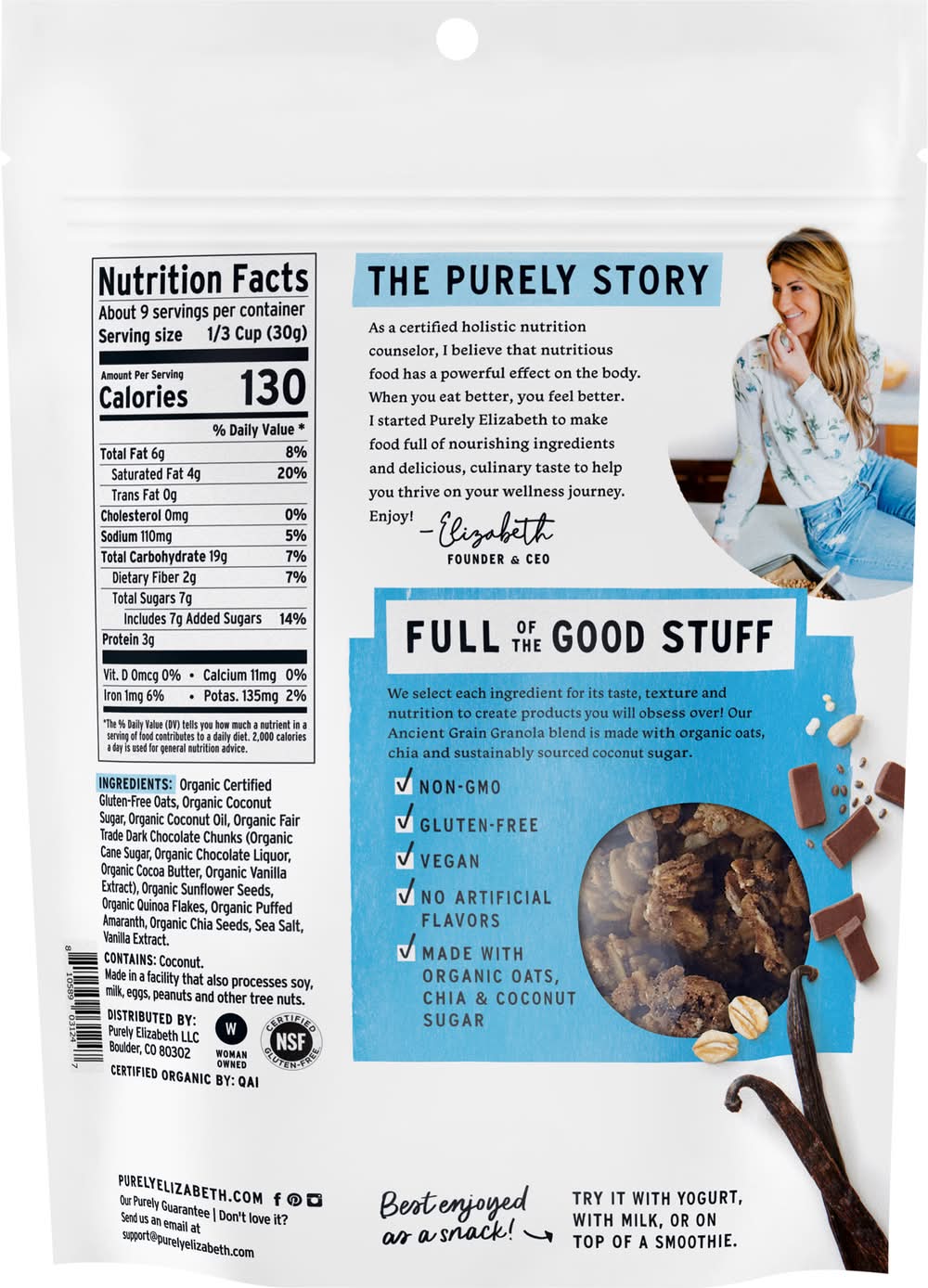 Salty-sweet crunchy clusters made with organic oats, chia & coconut sugar. No artificial flavors. Certified Organic by: QAI. Non-GMO Project verified. nongmoproject.org. New look. Same taste. Elizabeth: Created to help you thrive. Recipe no. 23. The Purely Story: As a certified holistic nutrition counselor, I believe that nutritious food has a powerful effect on the body. When you eat better, you feel better. I started Purely Elizabeth to make food full of nourishing ingredients and delicious, culinary taste to help you thrive on your wellness journey. Enjoy! Full of The Good Stuff: We select each ingredient for its taste, texture and nutrition to create products you will obsess over! Our Ancient Grain Granola blend is made with organic oats, chia and sustainably sourced coconut sugar. Flavor: Vanilla chocolate chip