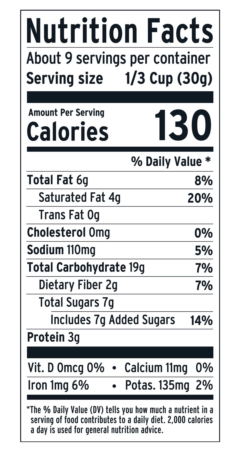 Ingredients: Organic Certified Gluten-Free Oats, Organic Coconut Sugar, Organic Coconut Oil, Organic Fair Trade Dark Chocolate Chunks (Organic Cane Sugar, Organic Chocolate Liquor, Organic Cocoa Butter, Organic Vanilla Extract), Organic Sunflower Seeds, Organic Quinoa Flakes, Organic Puffed Amaranth, Organic Chia Seeds, Sea Salt, Vanilla Extract Contains: Tree Nuts, Coconuts, Oat, Soybeans, Milk, Eggs, Peanuts, Tree Nuts